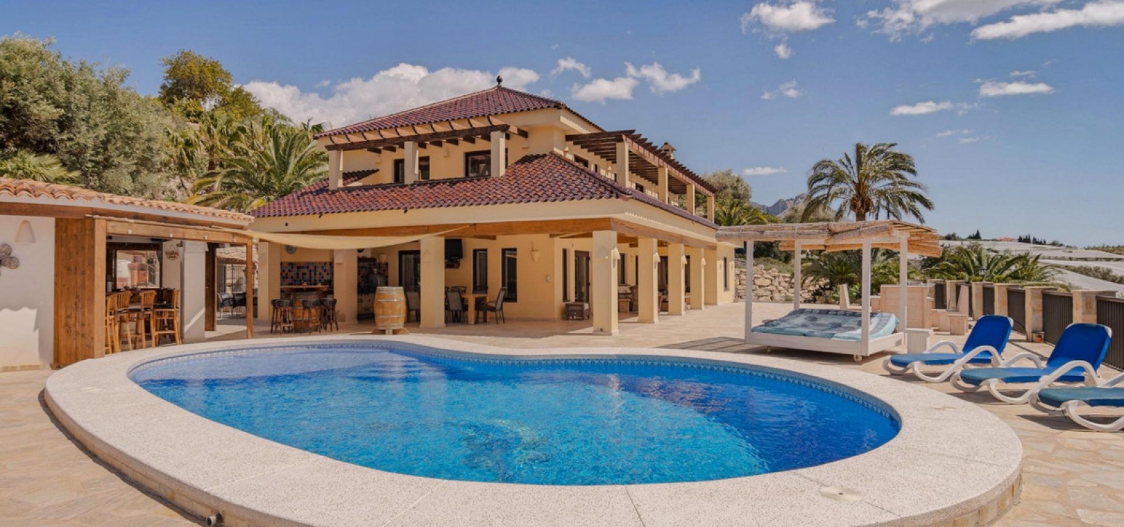 The house has terraces all around, so always a shady spot, and next to the pool a large outdoor kitchen, annex bar, which can be closed in the cooler winter months, so it can be used all year round.