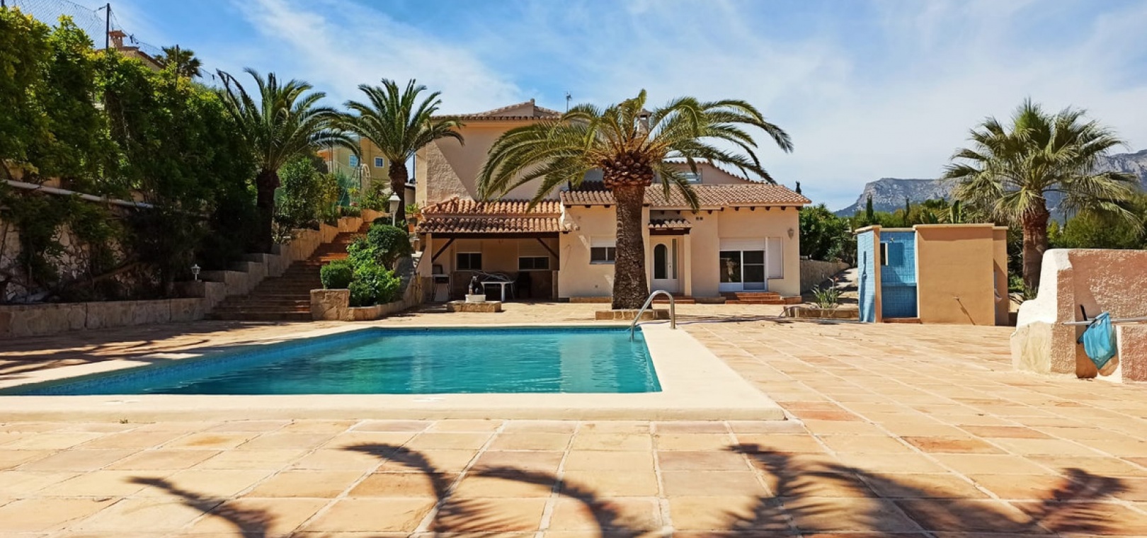 Cometa III Calpe - Villa with large plot and tennis court for sale. At Cometa III in Calpe, we present this beautiful villa on a plot of 5934 m², with tennis court, swimming pool, and a beautiful garden. The villa is divided into a main house and a guest house. Both the main and guest houses have a living room with kitchen. The main house has 3 bedrooms and 3 bathrooms. The guest house has 2 bedrooms and 2 bathrooms. In addition, the main house has a beautiful garden room and a covered terrace, with views of La Olta, Colina del Sol and Empedrola. The villa, tennis court and huge gardens are in excellent condition. The villa also has a garage for 1 car, and a carport for 2 cars. If needed, there is enough space to park a dozen vehicles in this property.