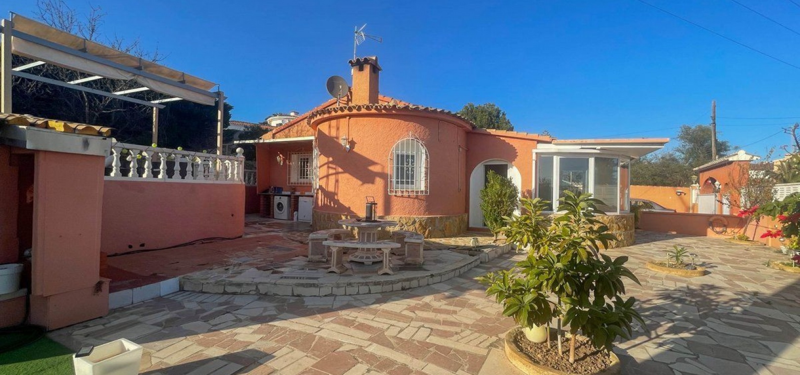 Outside, the property features a pool to cool off on hot days, complemented by a toilet and an outdoor shower. The garden surrounding the villa is adorned with fruit trees, creating a natural and fresh environment. The barbecue area is perfect for outdoor gatherings, while the laundry area adds practicality. The solarium and relaxation area offer spaces to unwind and enjoy the fresh air. Additionally, there is plenty of space to park several vehicles.