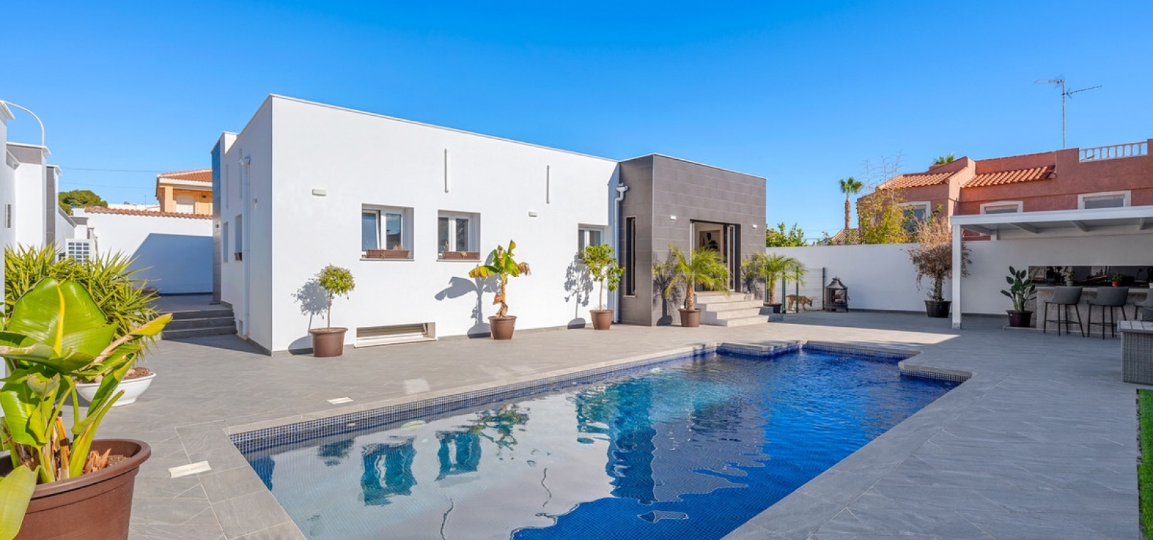 The exterior is designed to make the most of the excellent Costa Blanca climate thanks to a private 8x4 meter swimming pool and a fully equipped outdoor kitchen, which becomes the perfect place for al fresco meals and gatherings.