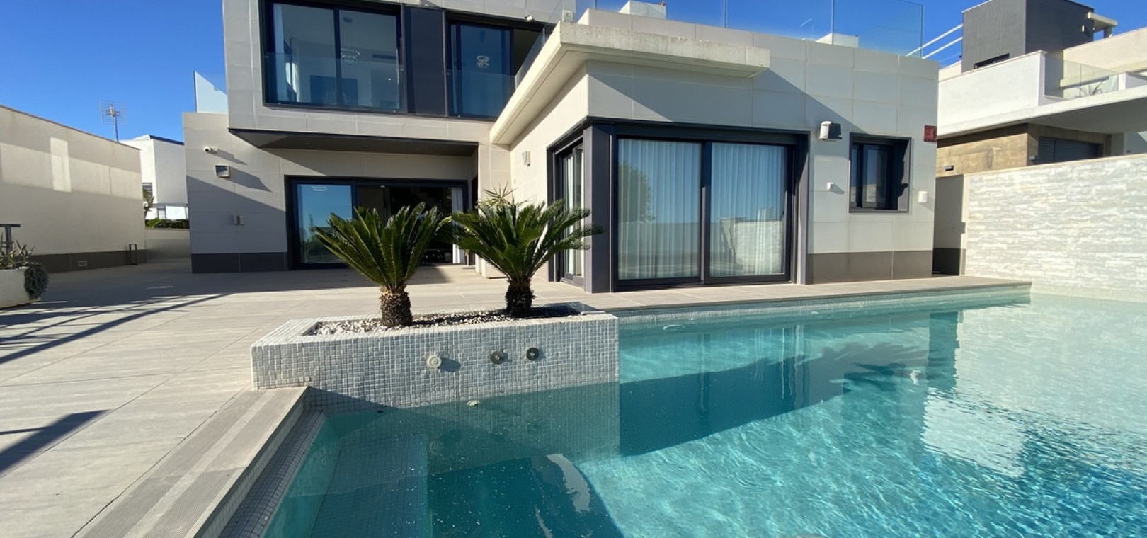 Welcome to this exceptional recently-built luxury villa at Residencial Bellavista, San Miguel de Salinas, offering a harmonious blend of contemporary design and breathtaking views. With a total of 5 bedrooms and 4 bathrooms, this meticulously crafted property spans two floors and a basement, accessible via a convenient elevator and a stunning glass staircase with interior lighting.
