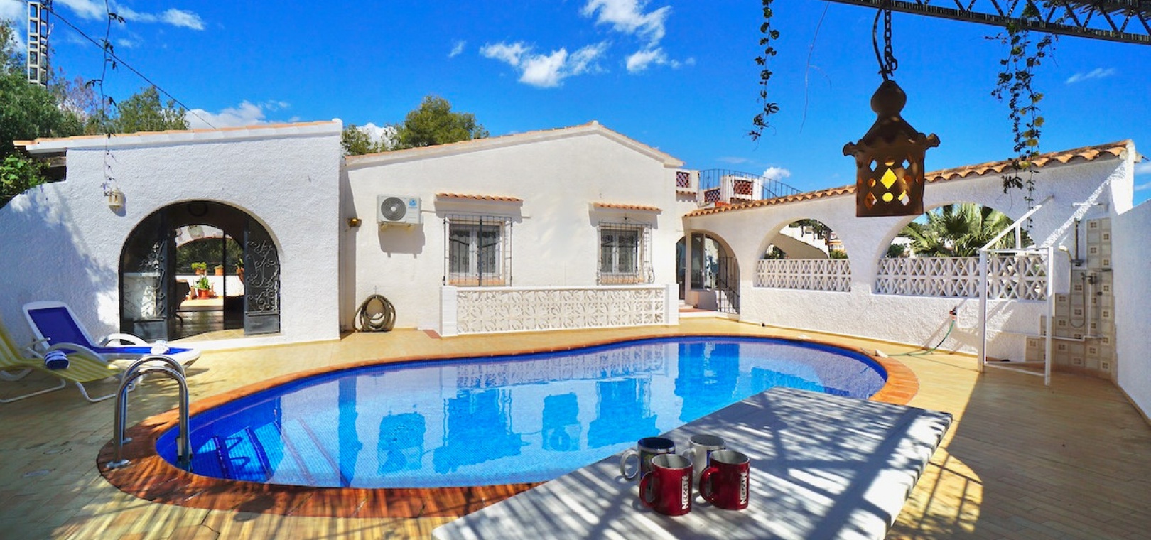 Outside, the villa is designed for easy living and entertaining, featuring a large terrace, a summer kitchen with a barbecue, and a private swimming pool that was renovated just four years ago. The low-maintenance garden adds to the charm, while a separate laundry/utility room provides extra convenience.