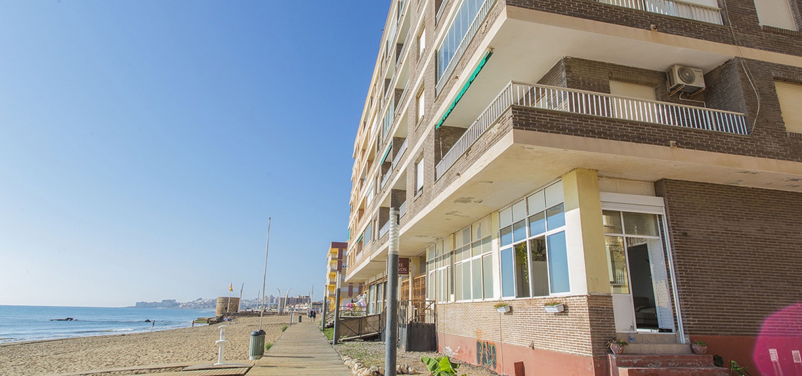 In the most exclusive location of La Mata in Torrevieja you will find this 2 bedroom apartment with fantastic sea views! Practically above the beach with direct access to the sand from the balcony. It is a ground floor, recently renovated. You just have to open the windows and you can hear the sound of the waves. Tastefully renovated and ready to move in! It consists of two bedrooms, a bathroom and a large living room with an open kitchen. Quality appliances and inverter type air conditioning.