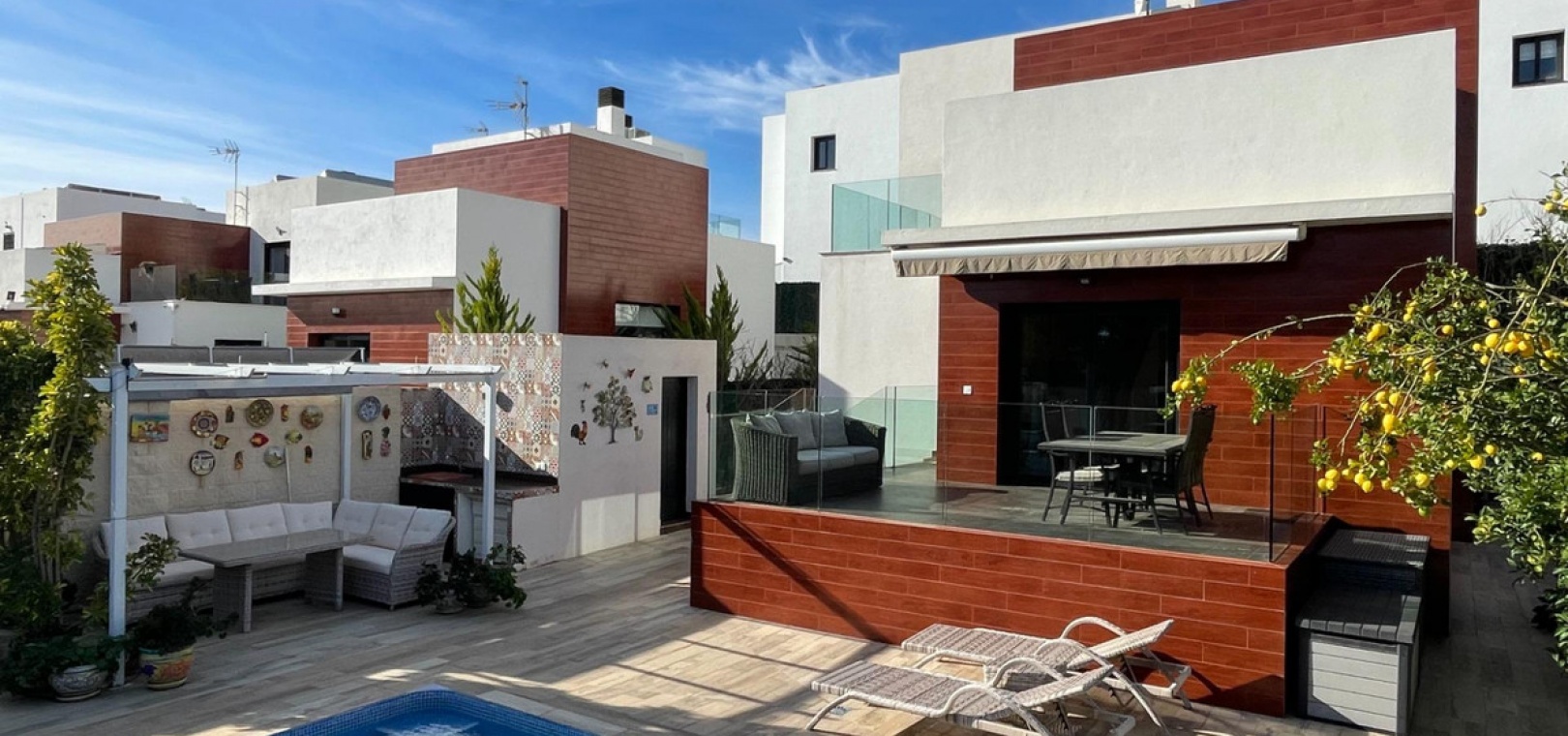 ???? Bo mellom hav og fjell: Privat villa i naturskjønne omgivelser ved foten av Ponoig-fjellet i Polop ⛰️???????????? House Advantages ????✨1️⃣ Unique locationThe house is located near the picturesque mountains "Leon Dormido" and "Puig Campana" ⛰️.From the balcony, you can enjoy beautiful views of the "Sierra Bernia" mountain range and even a glimpse of the sea ????.The area is very peaceful, surrounded by pine forests ????. The house is situated at the edge of the residential area — no houses in front, only pine trees and nature. Minimal traffic and absolute tranquility ????.2️⃣ Beautiful fruit garden ????????The garden includes persimmon (very sweet, non-astringent), peaches, níspero, apricots (very sweet), two mandarin trees, one orange tree, and two lemon trees.There are also decorative plants: olive tree, thuja, ficus, roses ????, schefflera, and plumbago with beautiful blue flowers ????.3️⃣ Additional storage houseIn the garden there is a separate composite storage house (2.10 x 2.7 m) ????, ideal for bicycles ????, tools, suitcases and more.4️⃣ Spacious swimming pool ????♂️Size 7 x 4 m, depth 2.20 m — deeper than most new builds (usually 1.60 m).5️⃣ Smart layout & spacious interiorsWell-designed layout with 3.80 m ceiling height in the living room, creating an airy and spacious feeling ☀️.Bedrooms: 11.03 m², 11.04 m², 11.88 m² — comfortably fit double beds ????️.6️⃣ Great infrastructure nearby ????️????️1.5 km to Ciudad Deportivo Camilo Cano sports complex with Olympic stadium, tennis courts ????, football fields ⚽, indoor & outdoor pools ????, gyms and more.Large shopping center nearby and a new English school ????.