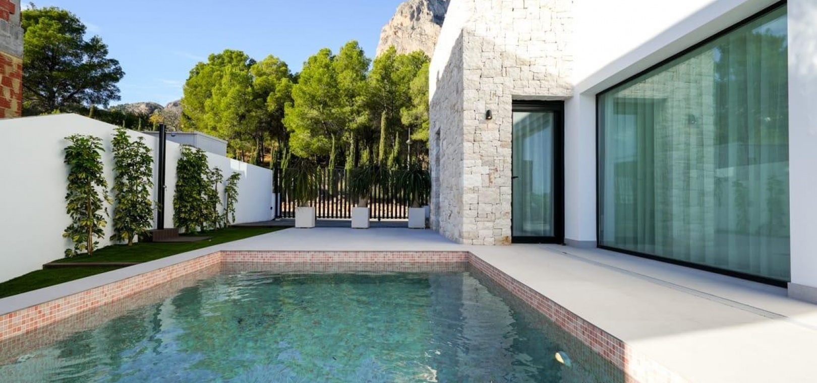 Independent villas with views of the sea and the mountains in the upper part of Polop, at the foot of Mount Ponoig.All include 3 bedrooms, 3 bathrooms, living room with equipped kitchen, dressing room, garage in the basement, large terraces, garden and private pool.Built with excellent qualities that include: porcelain stoneware floors, aluminum exterior carpentry with thermal break and double glazing, armored entrance door, built-in wardrobes, kitchen equipped with electrical appliances, aerothermal hot water, ducted air conditioning, underfloor heating. underfloor heating, motorized blinds, home automation and alarm system, decorative fireplace with bioethanol, infinity pool with glass front, etc.Located in the upper area of Polop, surrounded by nature, trees, mountains and with views of the sea. A quiet area, but well connected by the CV-70 road. Just 5 minutes from the towns of La Nucia and Polop, with all kinds of shops and services, and 15 minutes from Benidorm, its beaches, and the AP7 motorway that connects with the entire Costa Blanca.