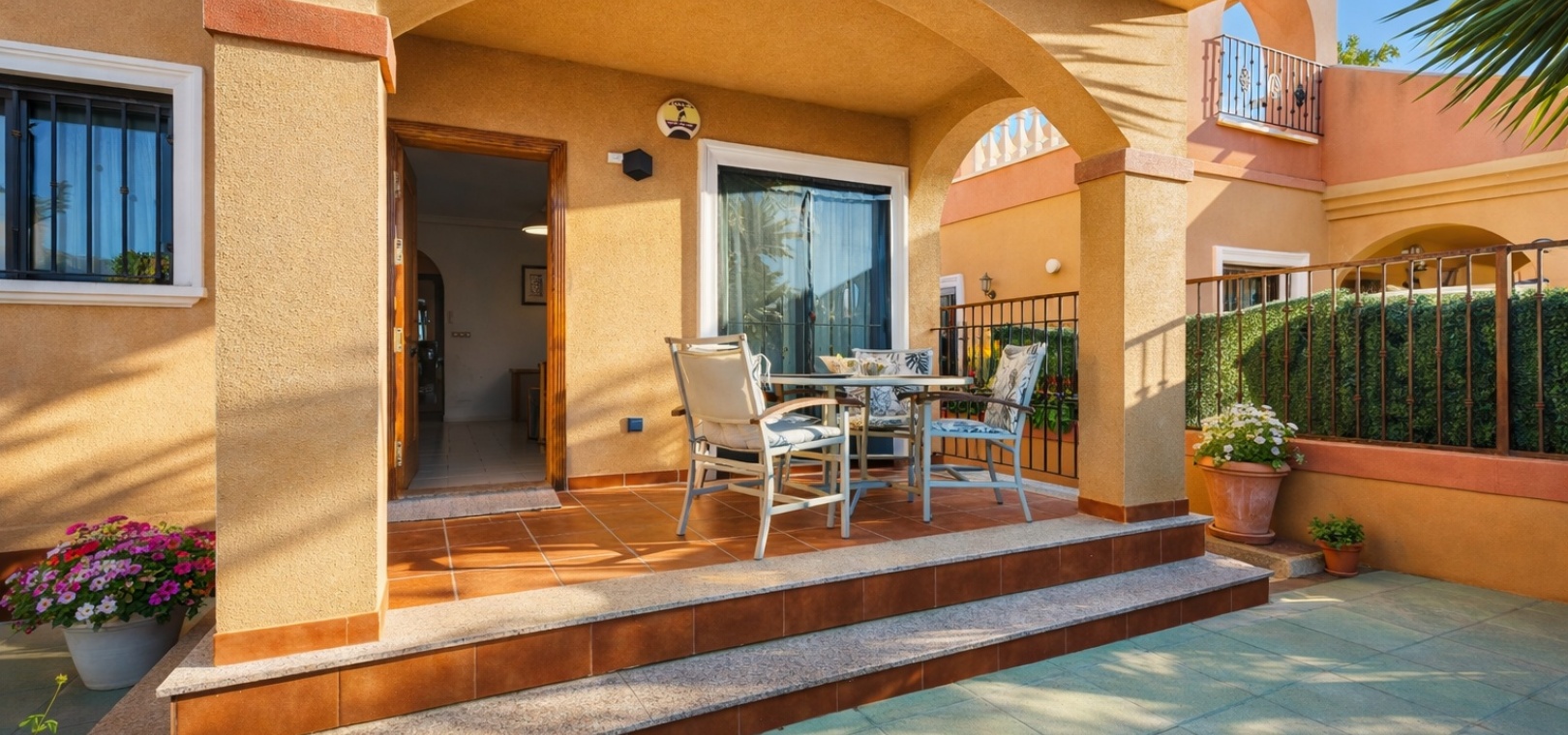 The villa features two bedrooms, two bathrooms, and an independent kitchen. A private solarium provides the perfect space to relax in the sun or enjoy outdoor gatherings, while residents also benefit from a communal swimming pool for cooling off during the warmer months.