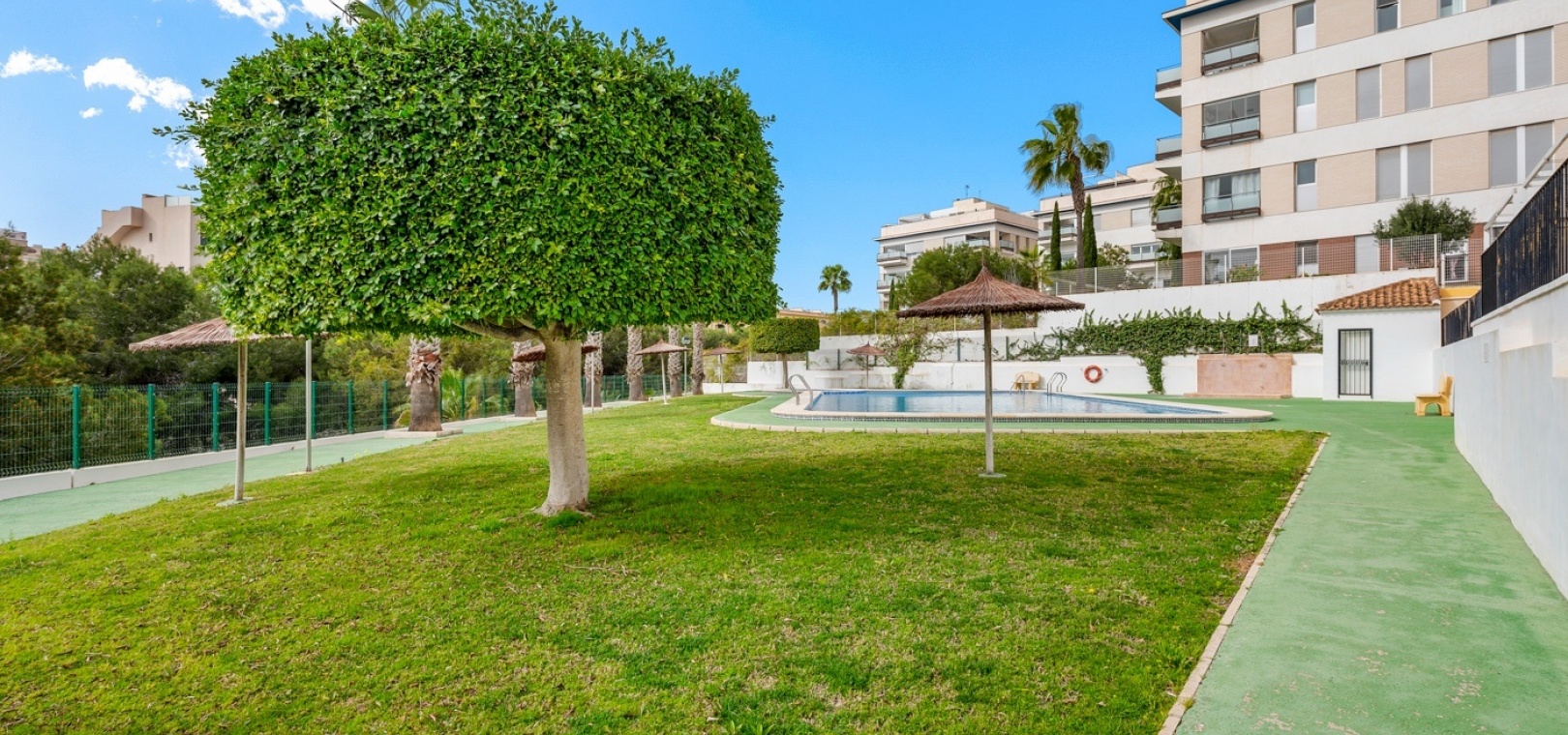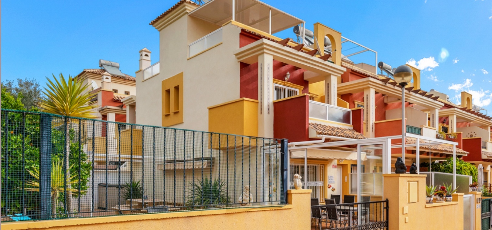 The townhouse is part of a gated residential community with access to a well-maintained communal swimming pool, perfect for enjoying the Mediterranean climate.