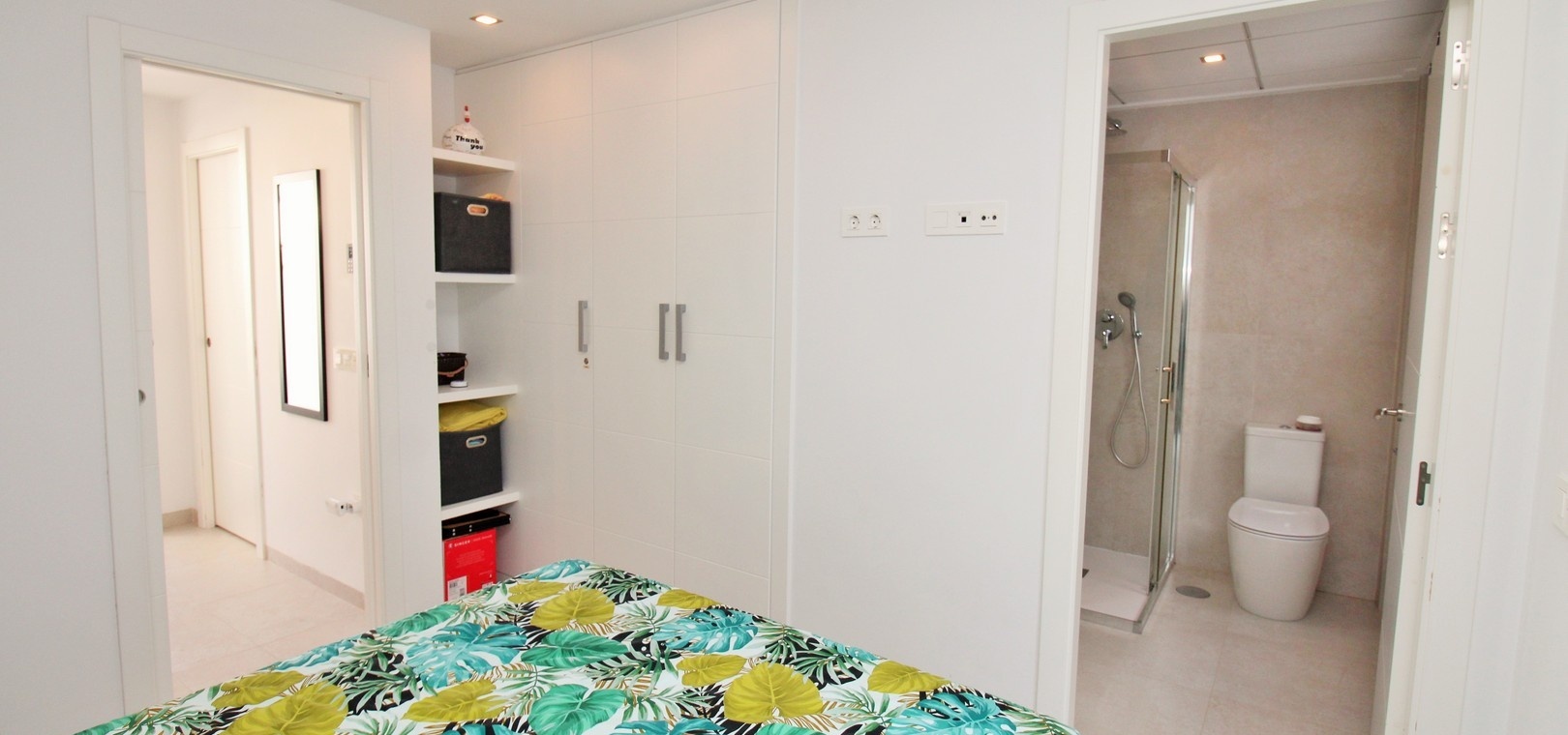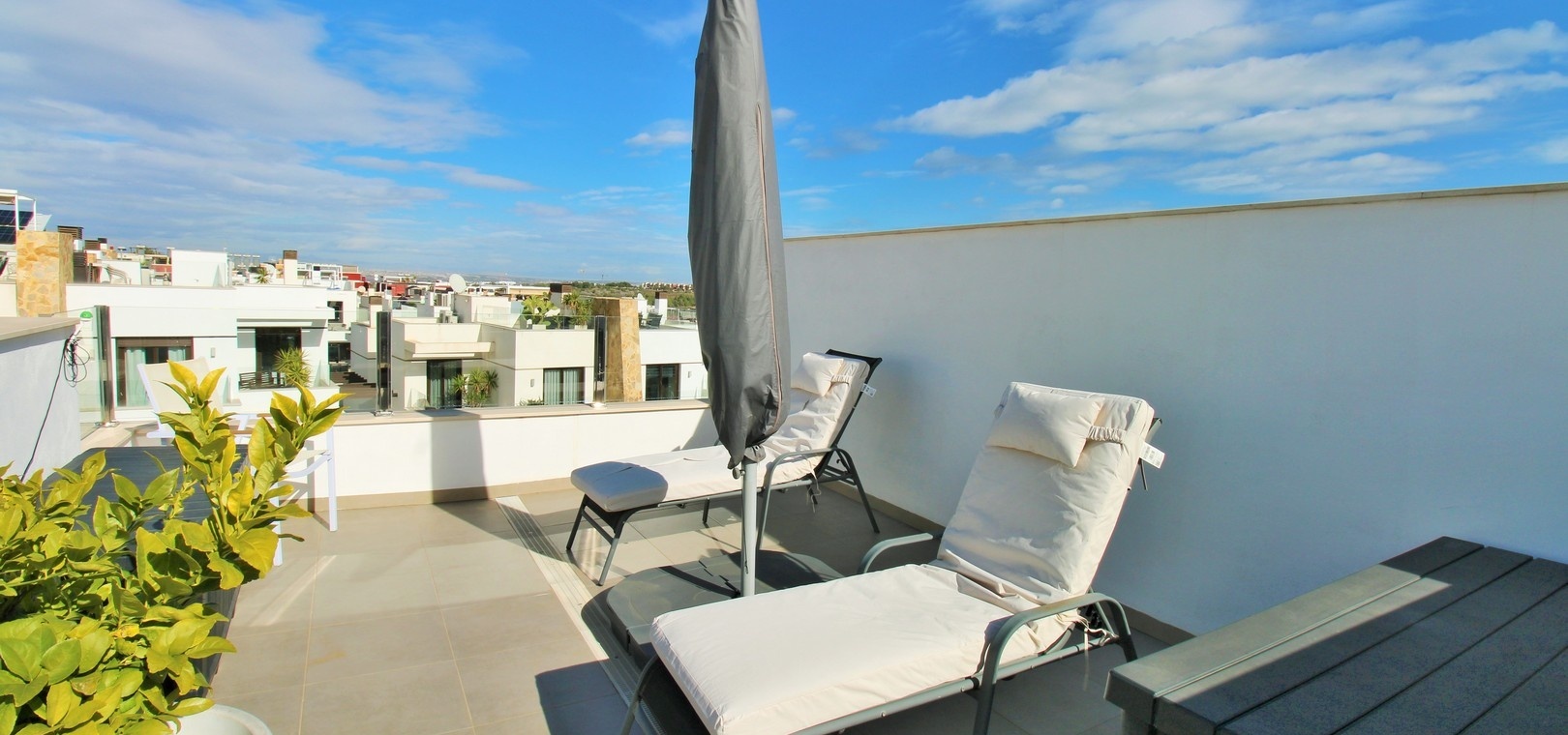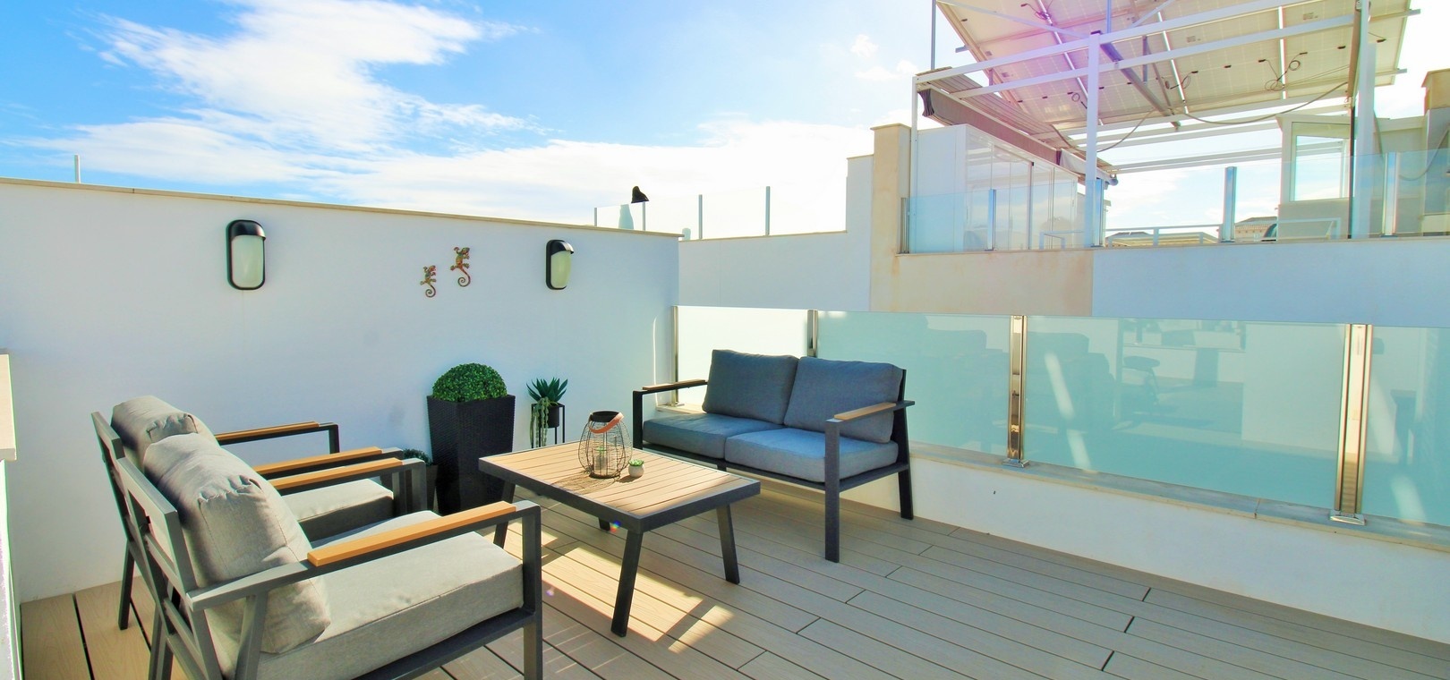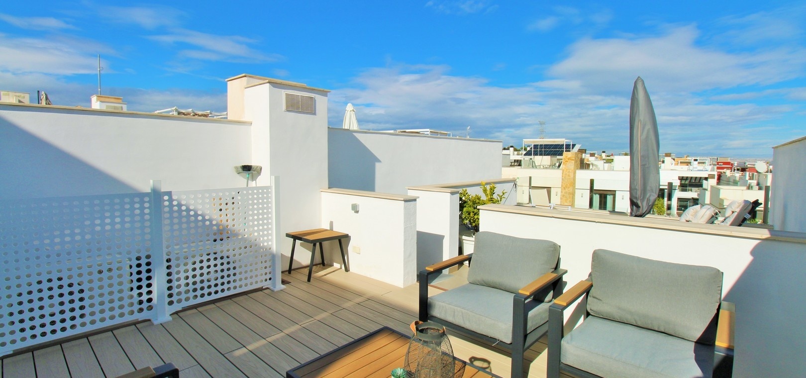 Upstairs, two double bedrooms both come with fitted wardrobes and en-suite bathrooms. One bedroom also benefits from a private terrace, offering additional outdoor space. External stairs lead to a private roof solarium, perfect for sunbathing, relaxing, or enjoying al fresco dining throughout the year.