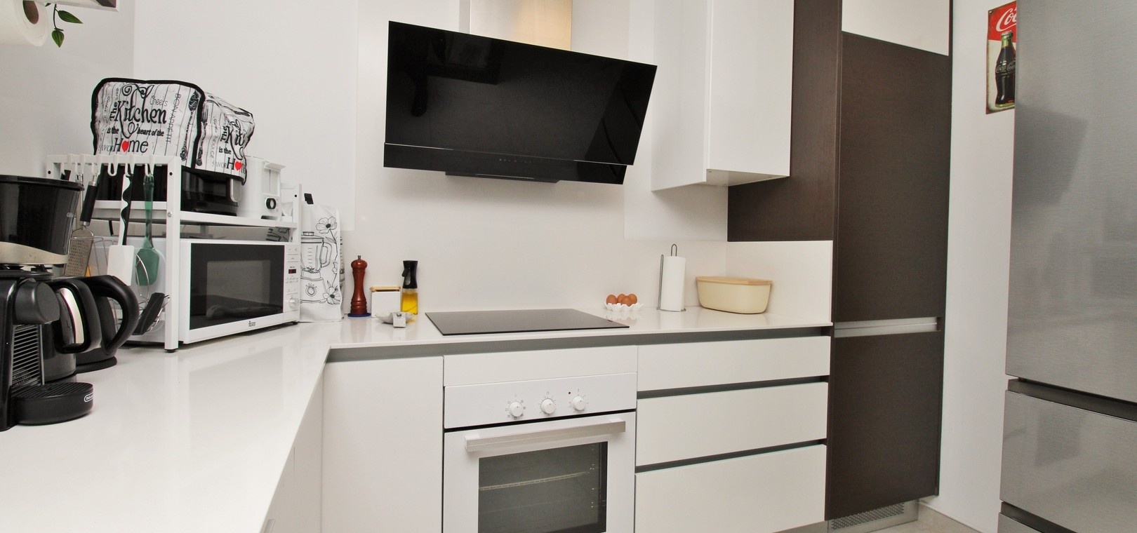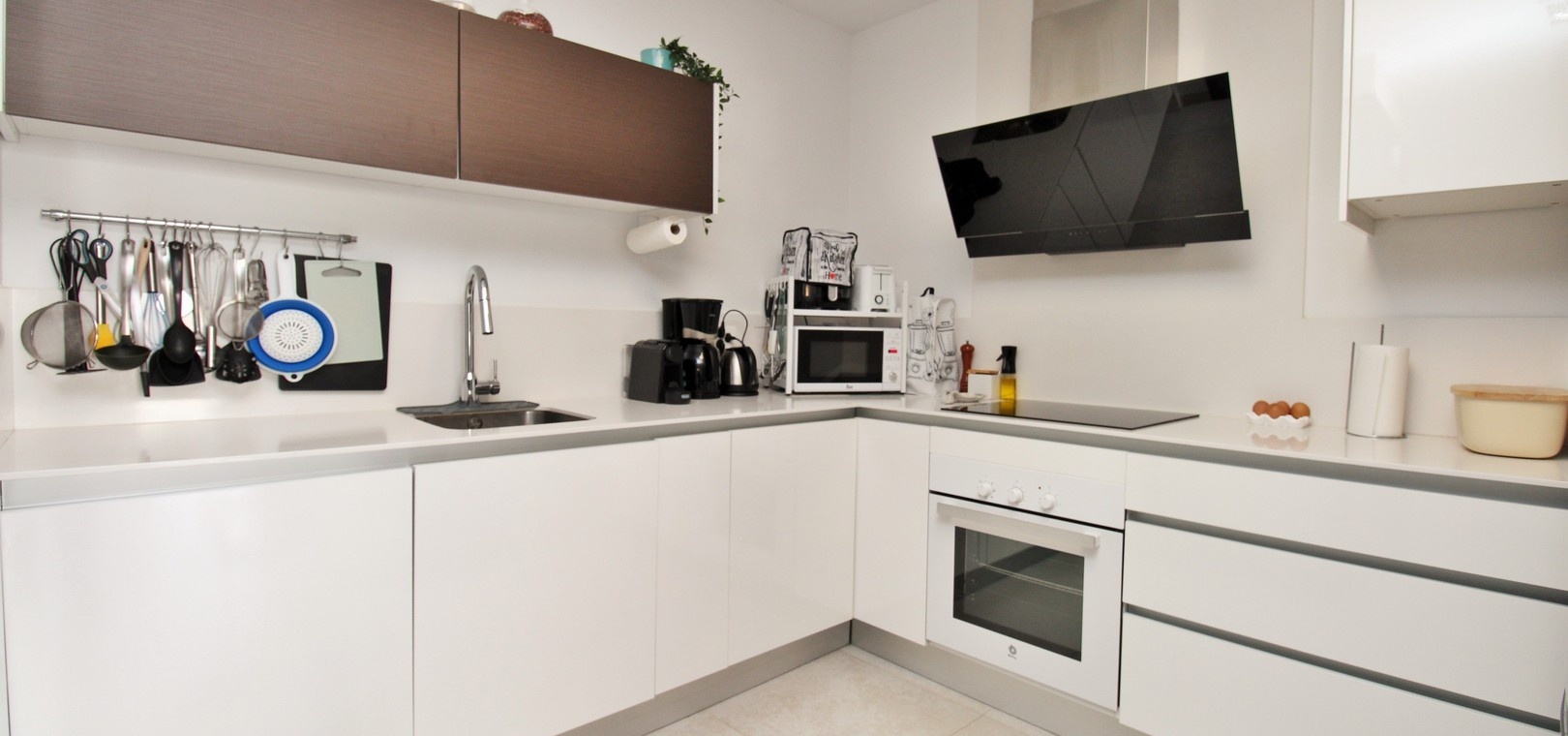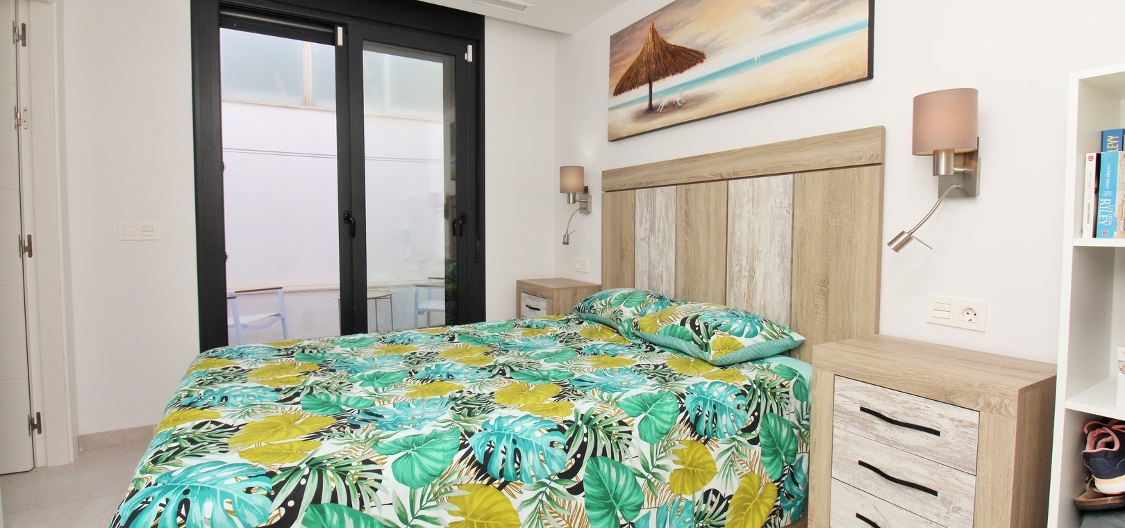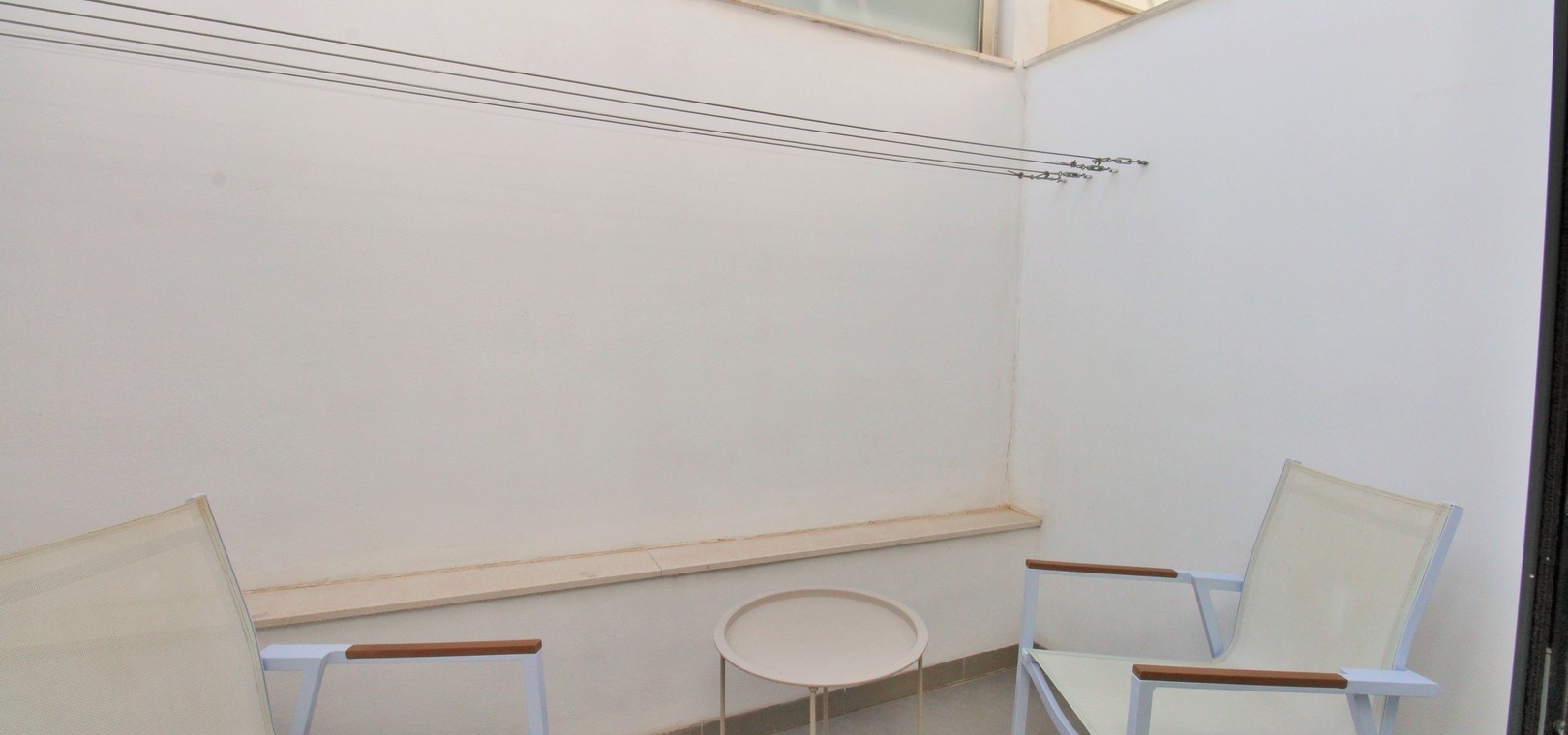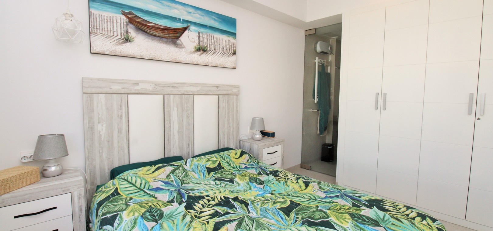 Upstairs, two double bedrooms both come with fitted wardrobes and en-suite bathrooms. One bedroom also benefits from a private terrace, offering additional outdoor space. External stairs lead to a private roof solarium, perfect for sunbathing, relaxing, or enjoying al fresco dining throughout the year.