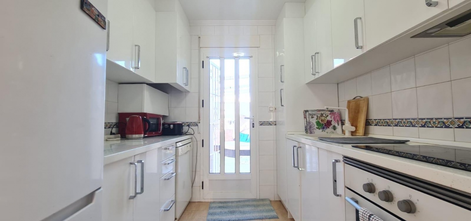 Accessed via steps, the villa features a glazed front terrace that leads into a bright and airy lounge-dining room, complete with hot and cold air conditioning. The fitted kitchen has been recently updated with new cupboards and provides direct access to the rear garden and private swimming pool—perfect for outdoor living.