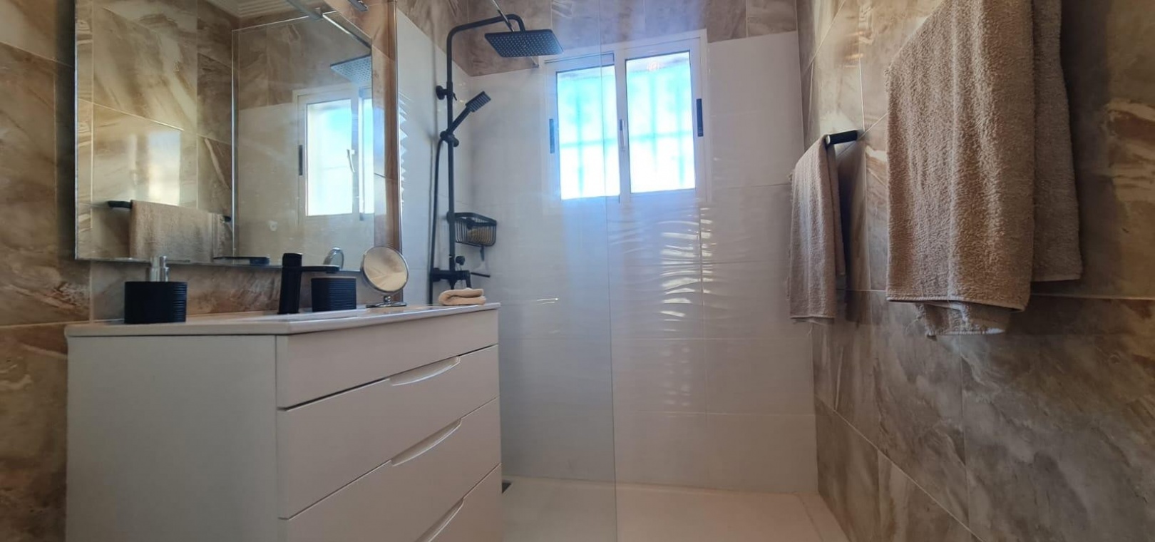 The ground floor also includes 2 x double bedrooms and a shower room, ideal for guests or convenient single-level living. Upstairs, there is a further double bedroom with its own private terrace, along with a family bathroom.