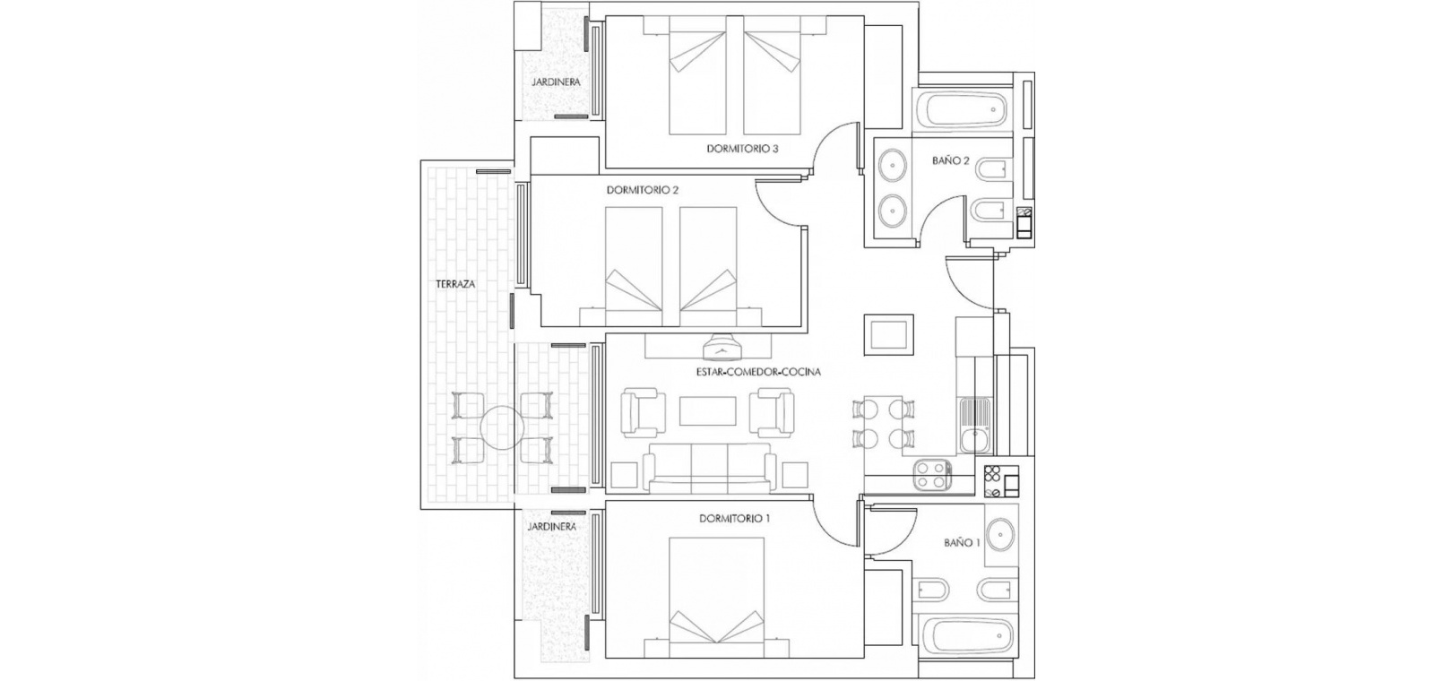 The development offers 1, 2 and 3 bedroom apartments with 1 or 2 bathrooms, available as ground floor units with large terraces, middle floor apartments or penthouses, some with private solariums.