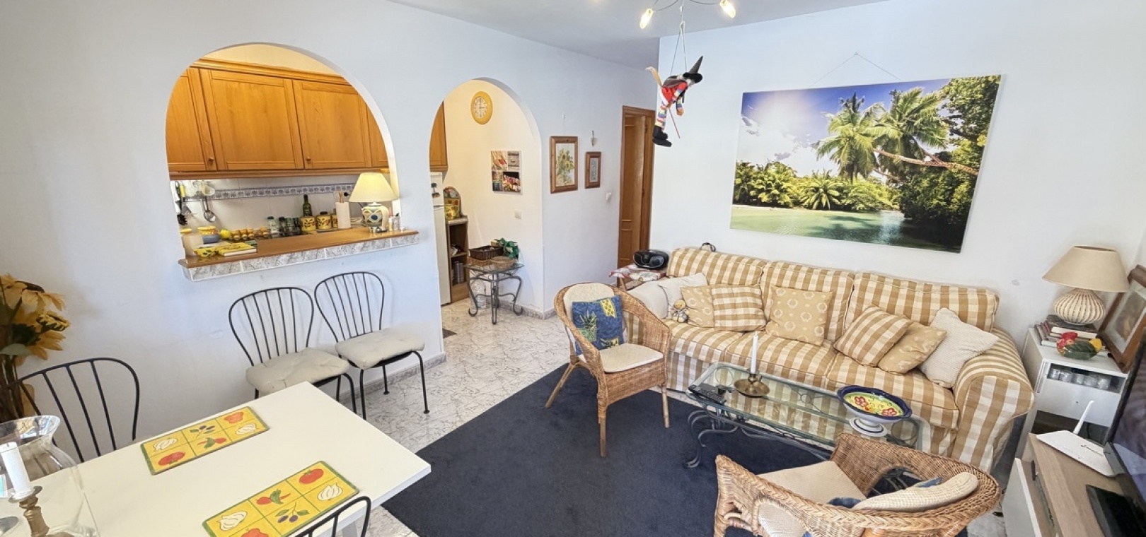The property enjoys a prime position overlooking the communal swimming pool, creating a relaxed and inviting atmosphere. It features two well-proportioned bedrooms and a bright open-plan living area that seamlessly combines the lounge, dining space, and kitchen.