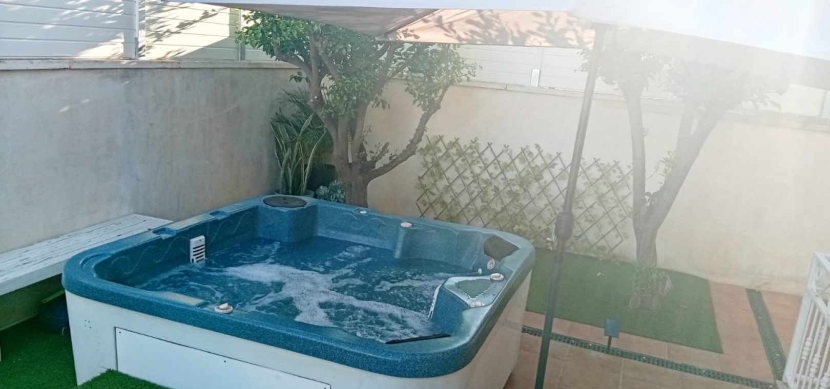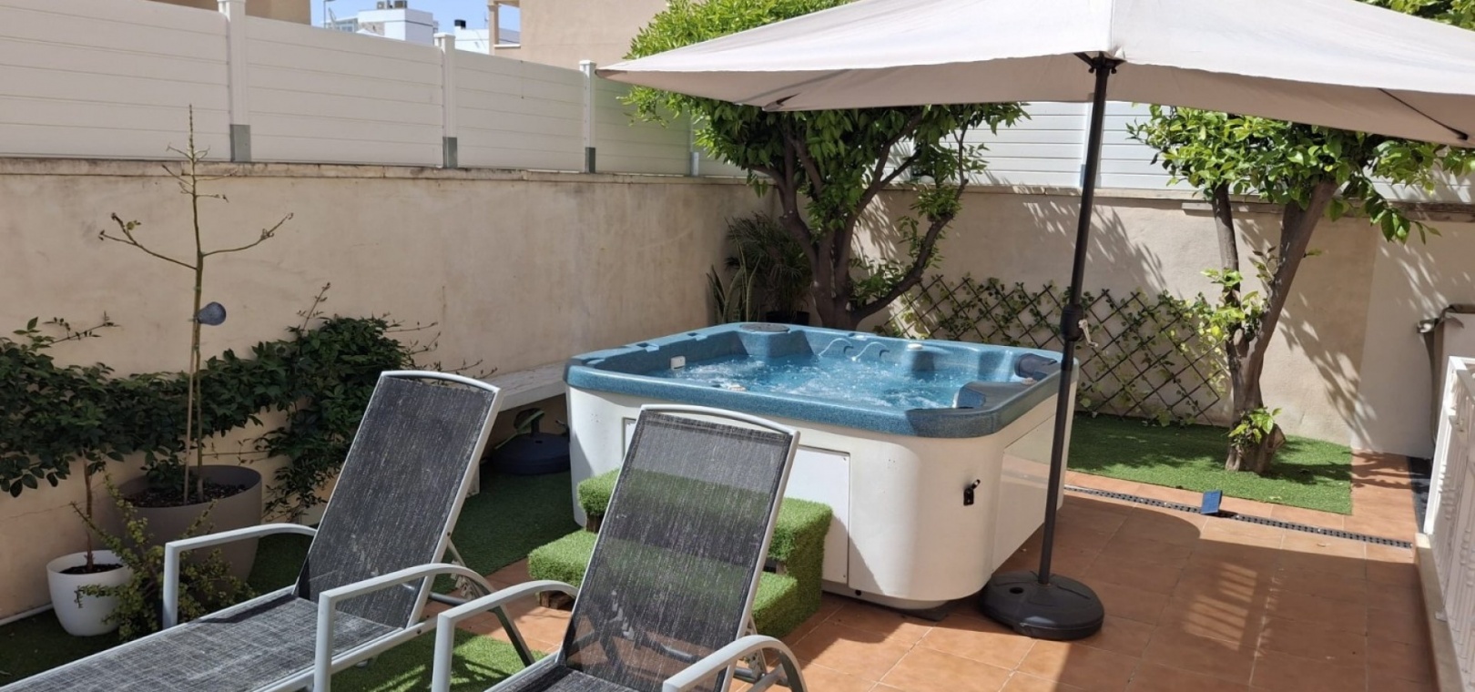 Outside, the property includes private outdoor space with a jacuzzi and off-road parking. Residents also benefit from access to a nearby communal swimming pool, well maintained and located within easy walking distance.