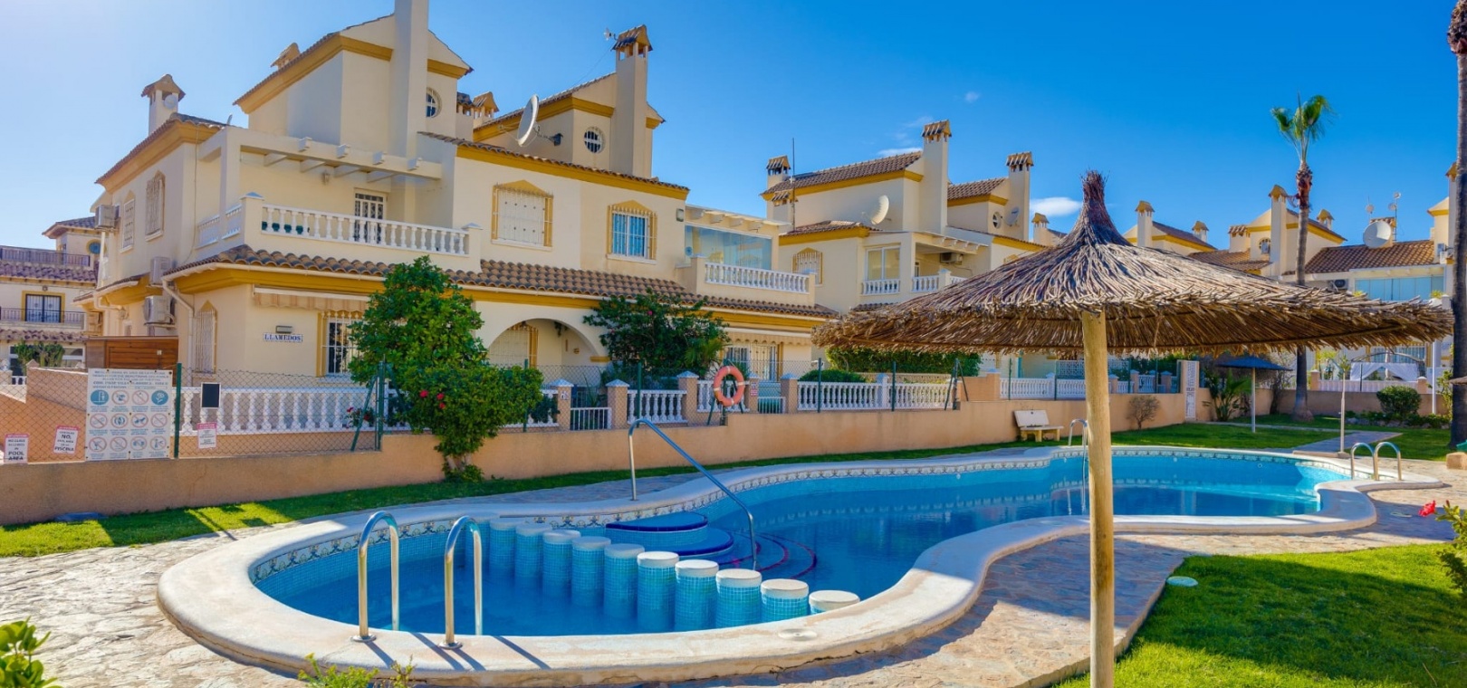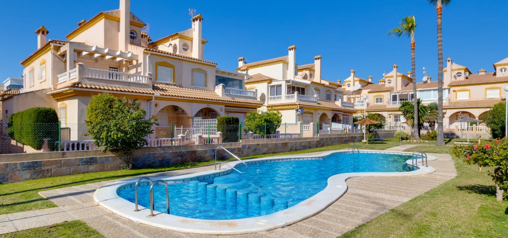 Spacious south-facing townhouse located in the sought-after Res. Villa Flamenca development in Playa Flamenca, offering comfortable living in a prime Costa Blanca location.