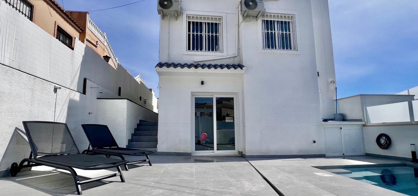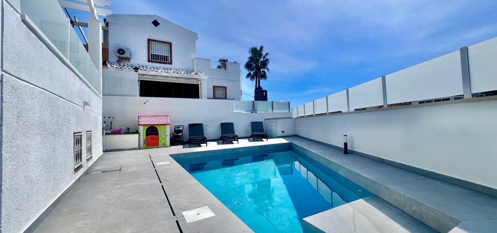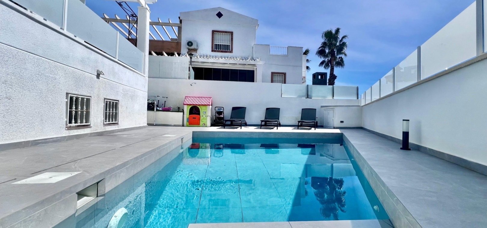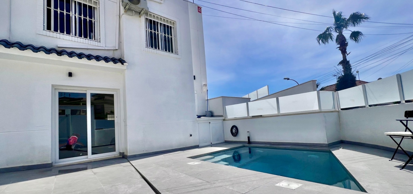 The villa has been fully refurbished and is equipped with air conditioning throughout. The outdoor areas are designed for easy maintenance, with sections of artificial turf adding practicality to the plot.