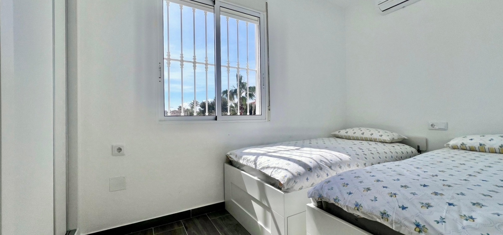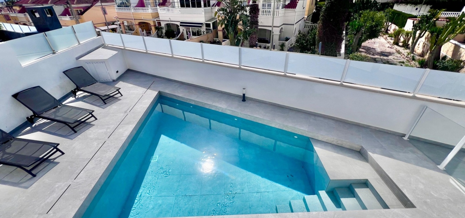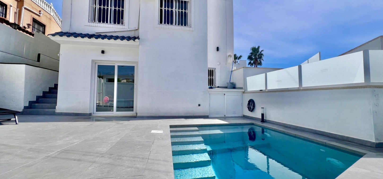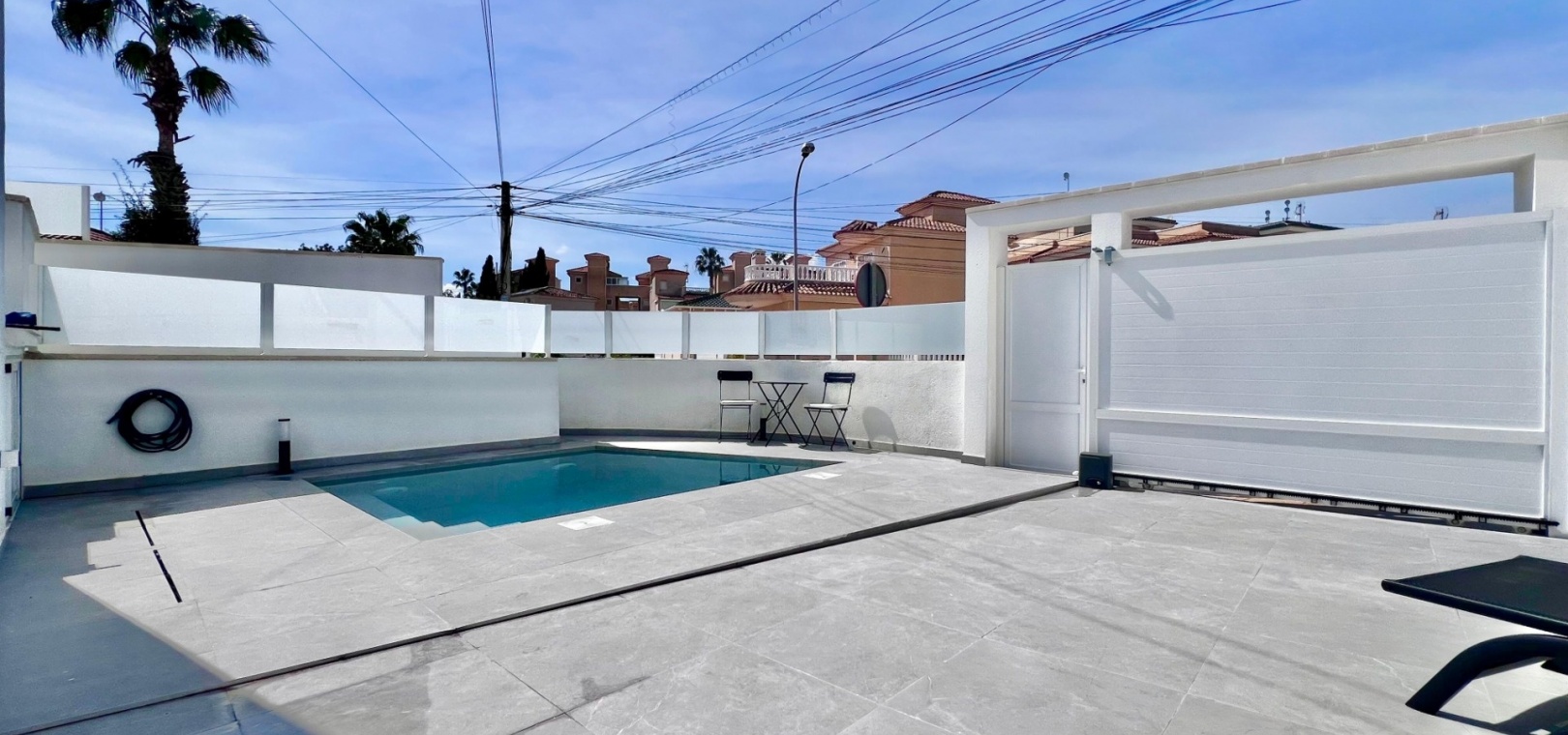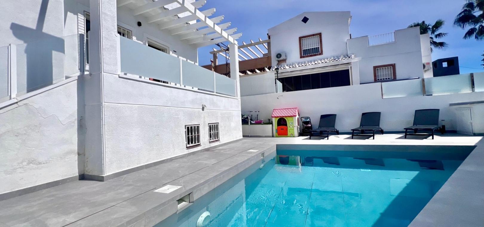 The villa has been fully refurbished and is equipped with air conditioning throughout. The outdoor areas are designed for easy maintenance, with sections of artificial turf adding practicality to the plot.