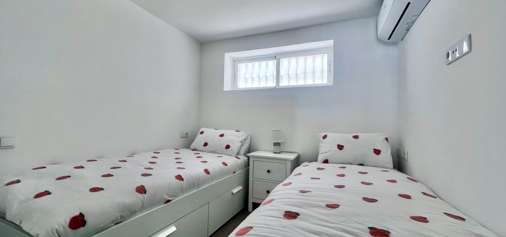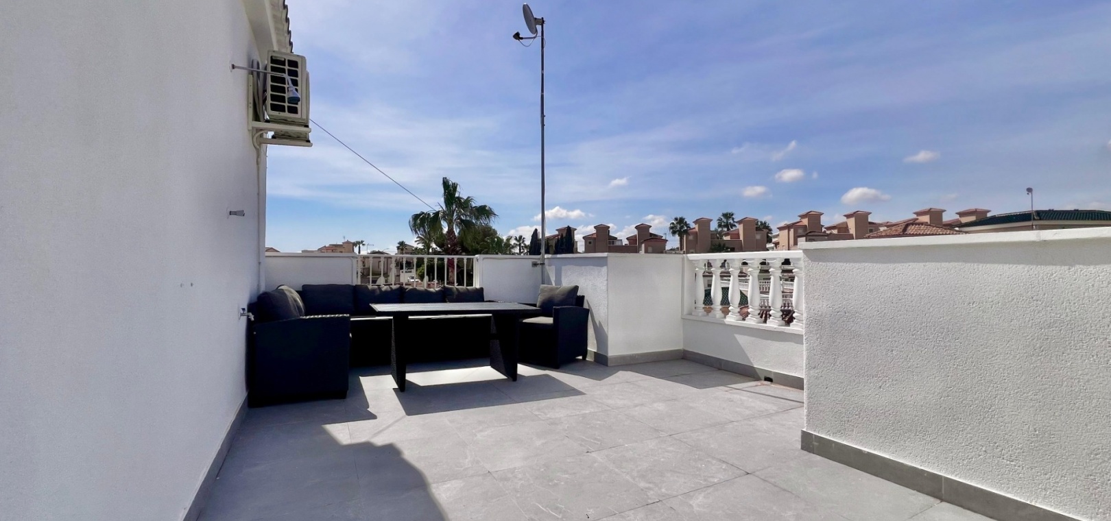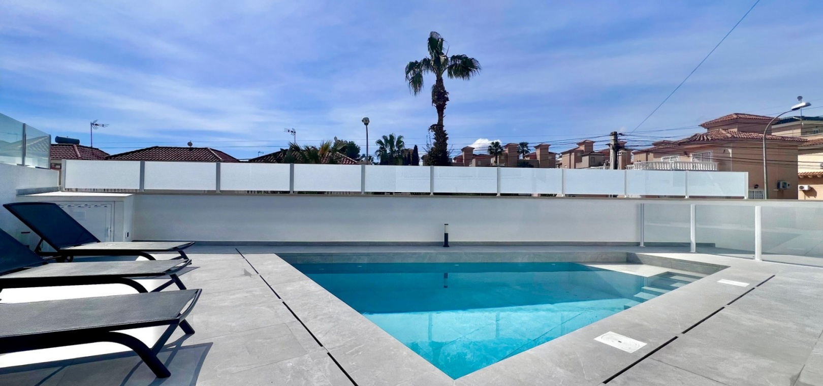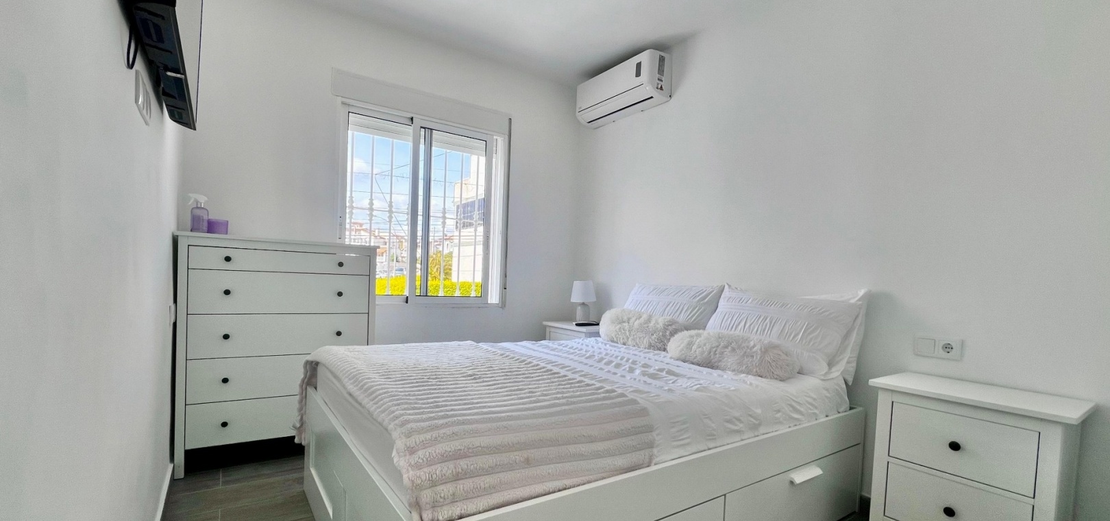 The villa has been fully refurbished and is equipped with air conditioning throughout. The outdoor areas are designed for easy maintenance, with sections of artificial turf adding practicality to the plot.