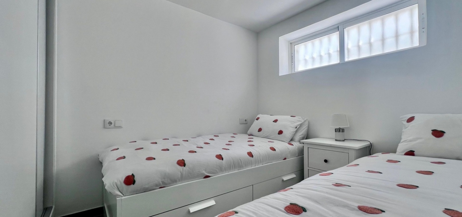 On the main floor, the entrance opens onto a private outdoor area featuring a swimming pool and covered porch. Inside, there is a bright open-plan living and dining area with a modern kitchen, two bedrooms, and a full bathroom. This level also benefits from access to a private solarium, ideal for enjoying the Mediterranean climate throughout the year.