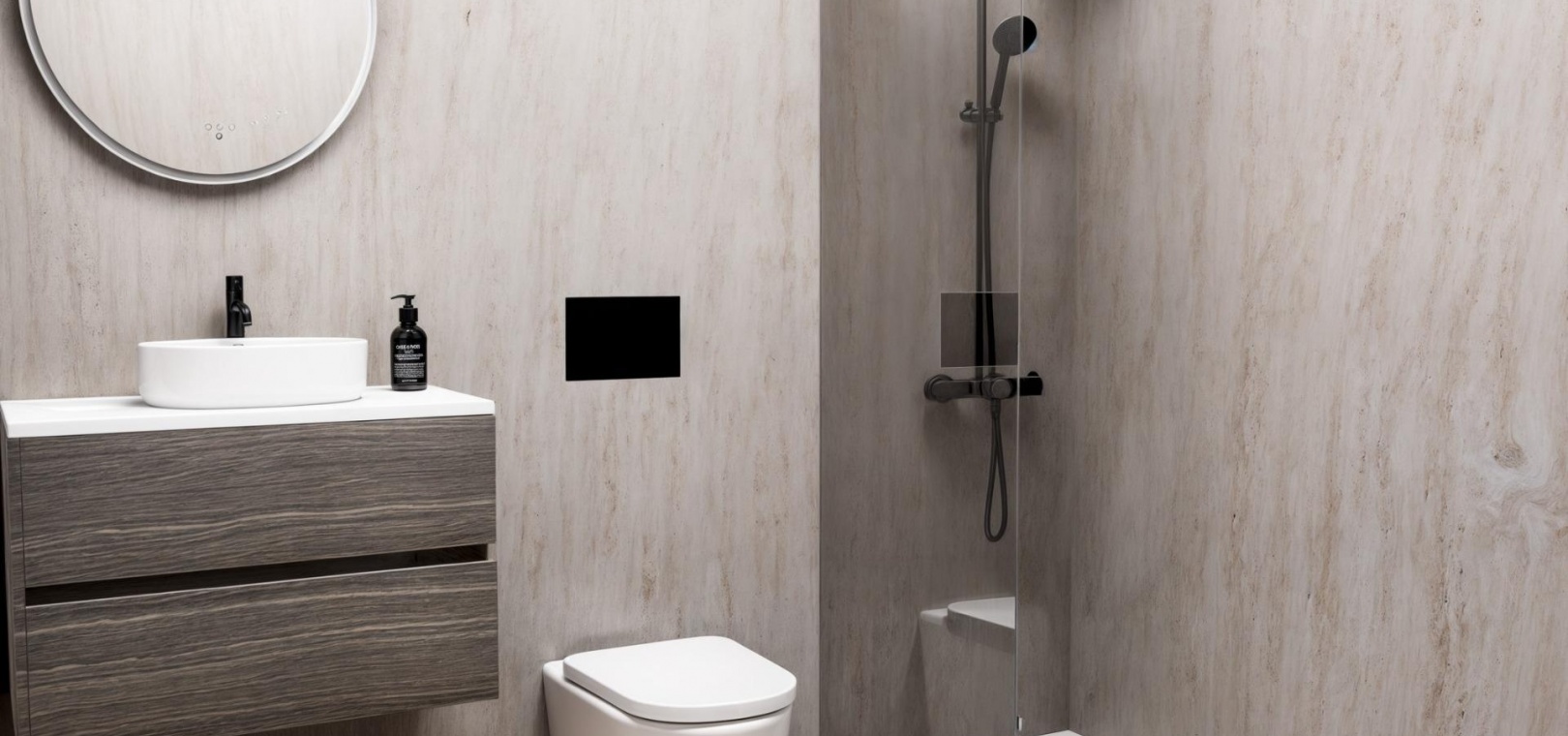 Furnished bathrooms with backlit mirrors