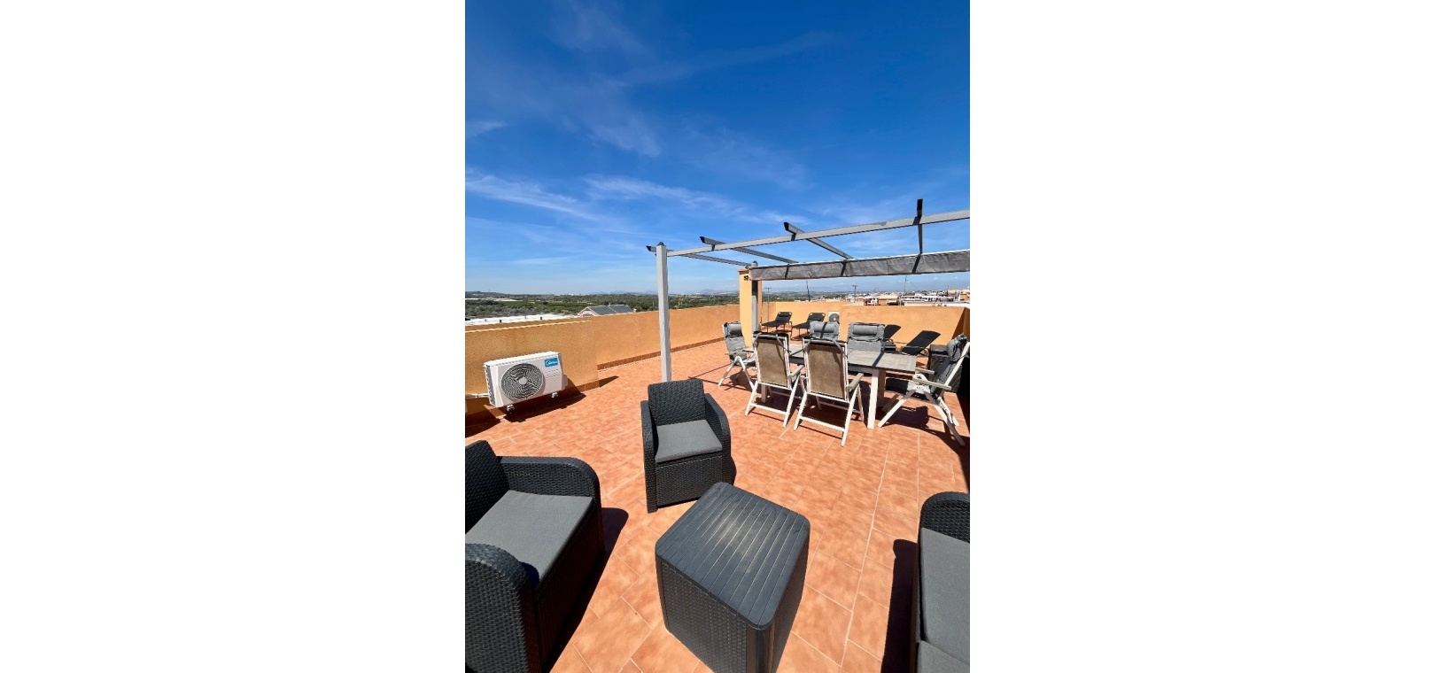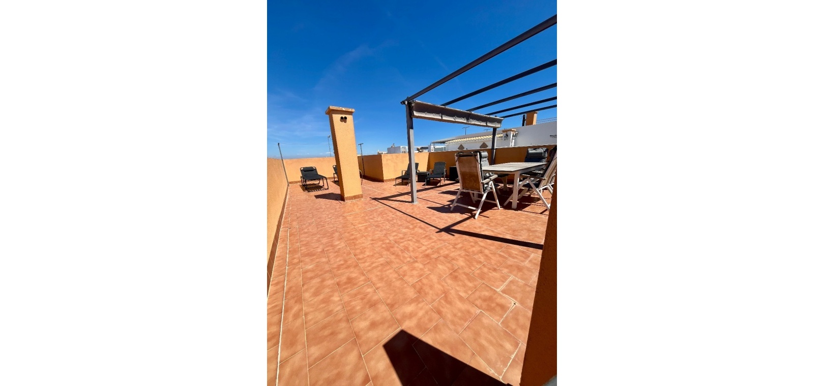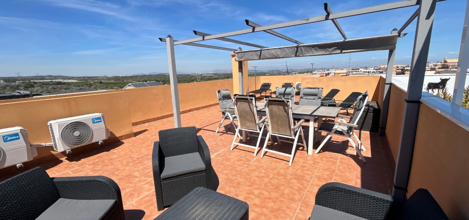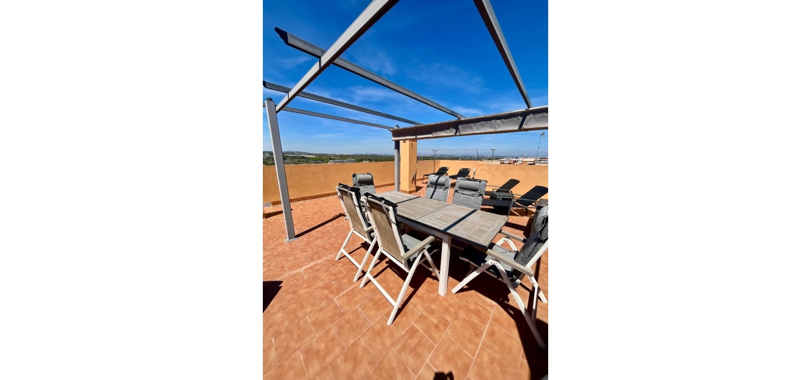 From the lounge, double doors lead to a private terrace, ideal for relaxing, while a second larger terrace provides ample space for outdoor dining. From here, stairs lead up to a spacious private rooftop solarium—perfect for sunbathing, entertaining, or enjoying panoramic views of the surrounding countryside.