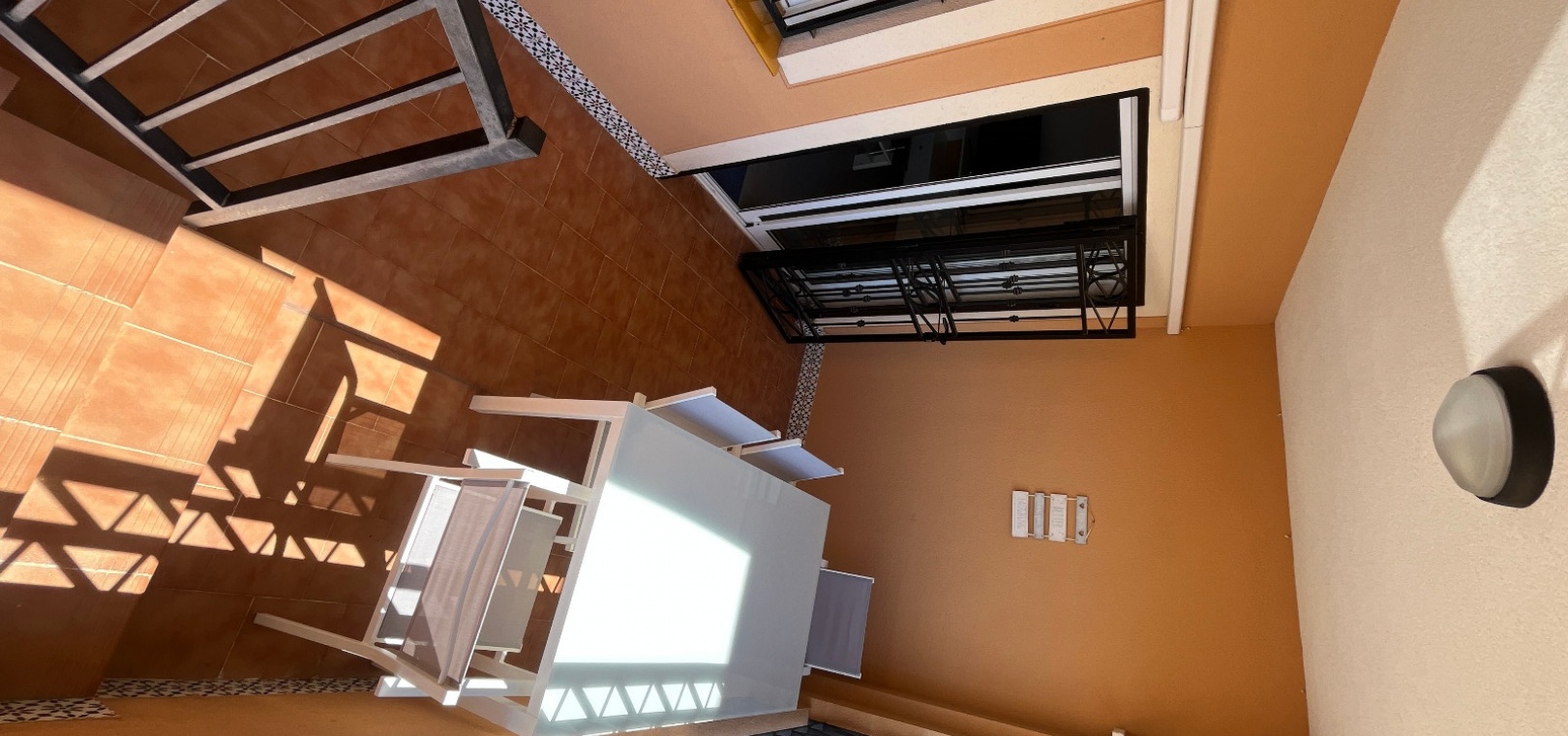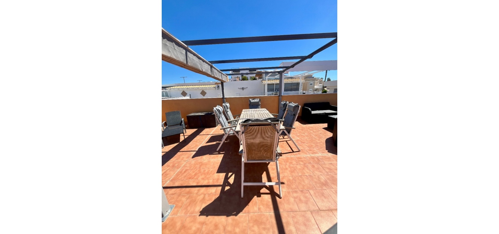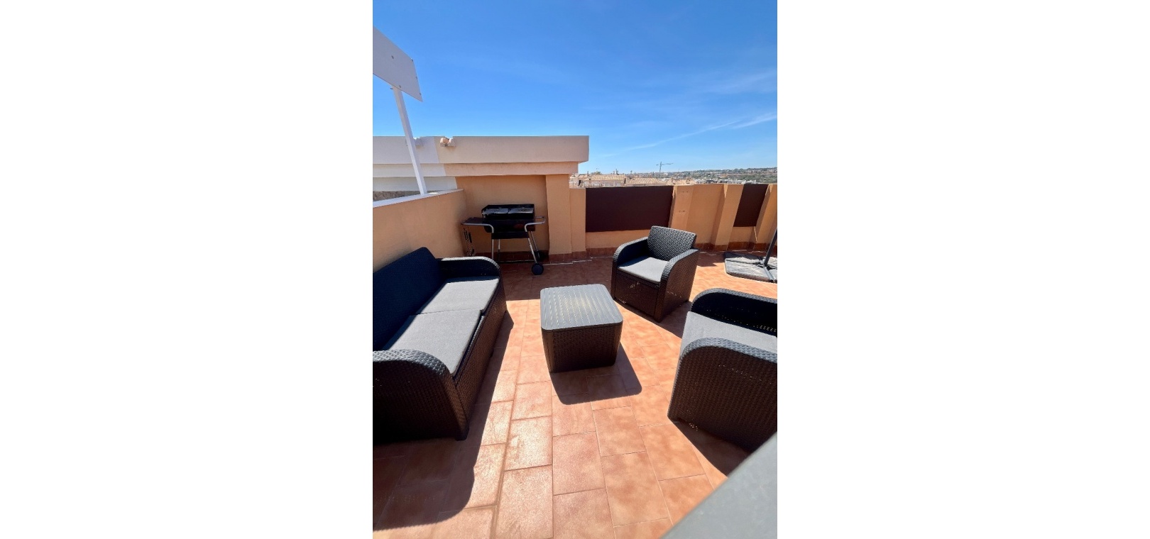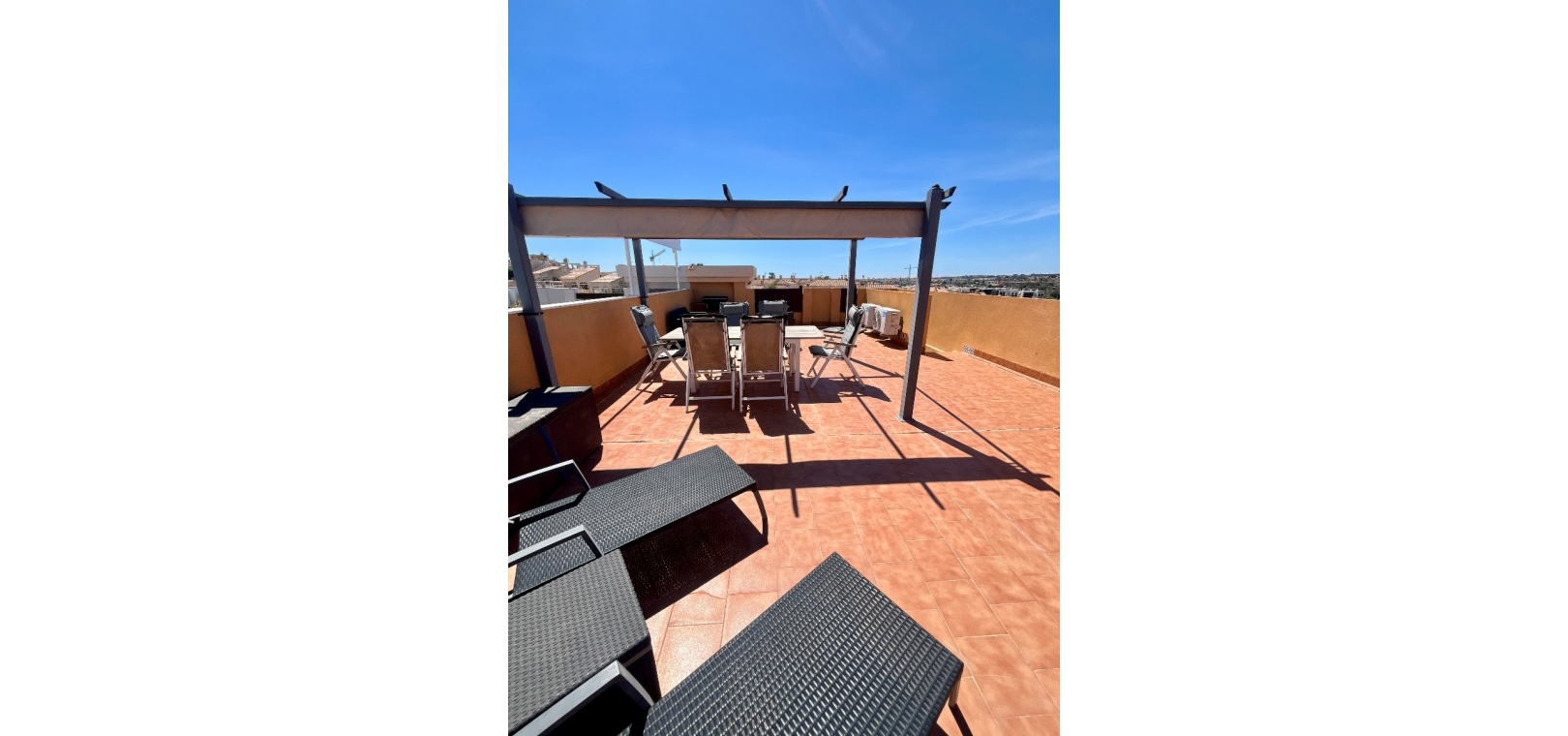 From the lounge, double doors lead to a private terrace, ideal for relaxing, while a second larger terrace provides ample space for outdoor dining. From here, stairs lead up to a spacious private rooftop solarium—perfect for sunbathing, entertaining, or enjoying panoramic views of the surrounding countryside.