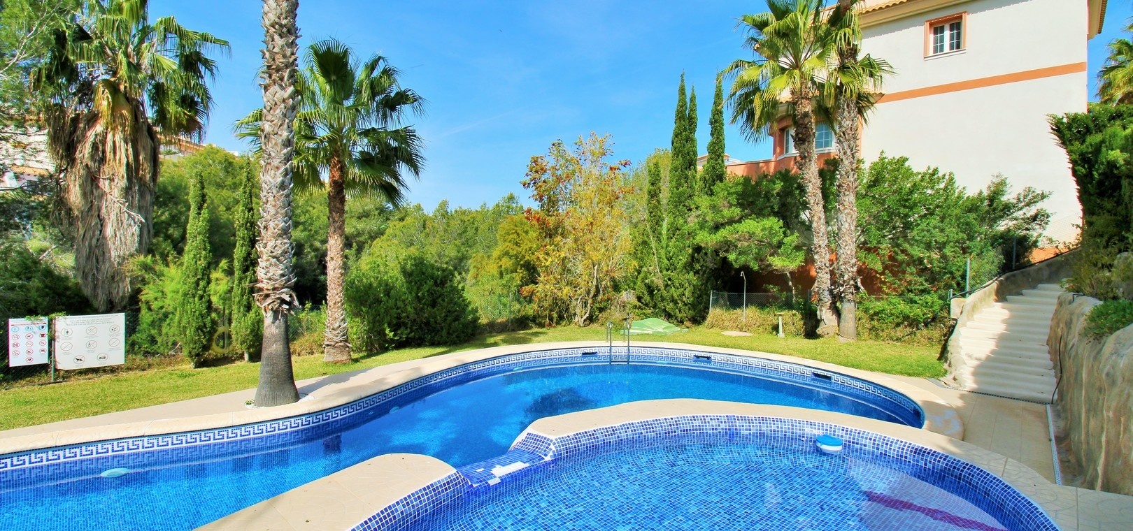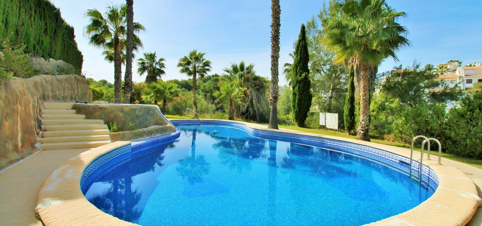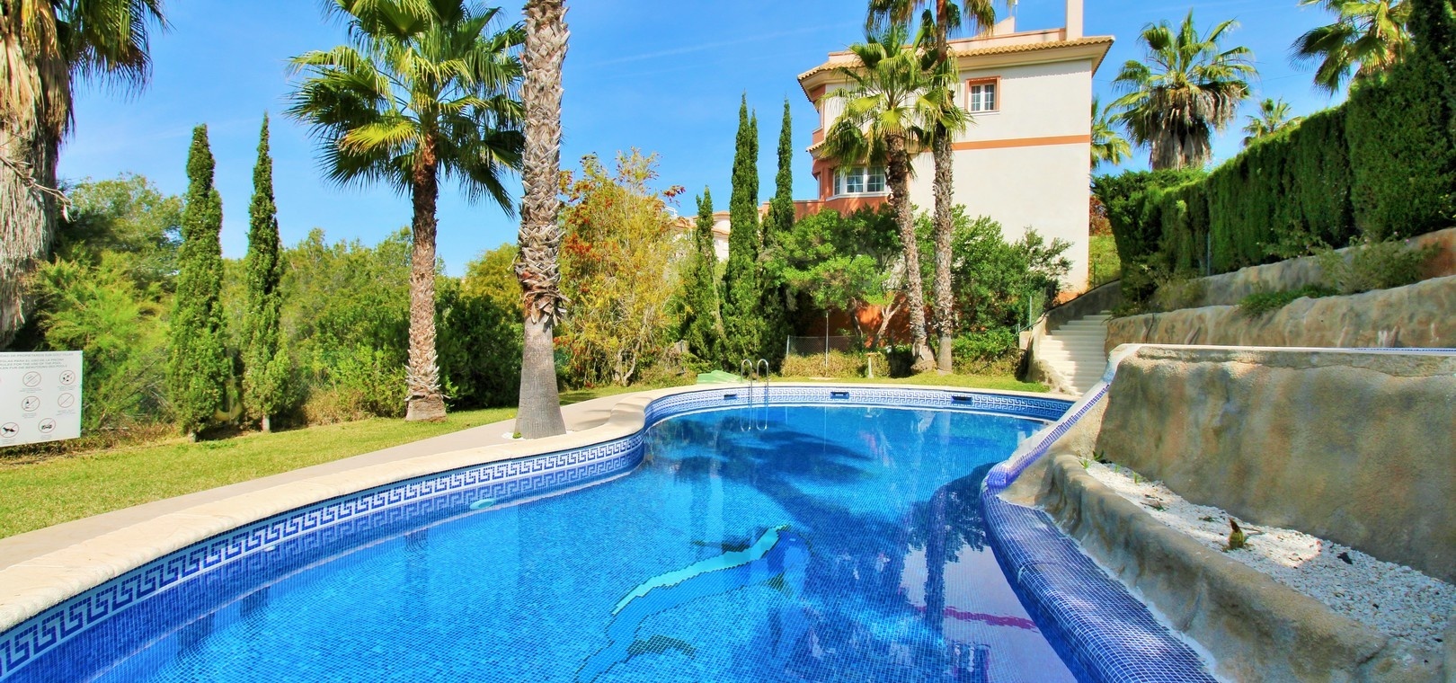 Residents have access to a beautifully maintained communal swimming pool, perfect for relaxing in the Mediterranean climate.