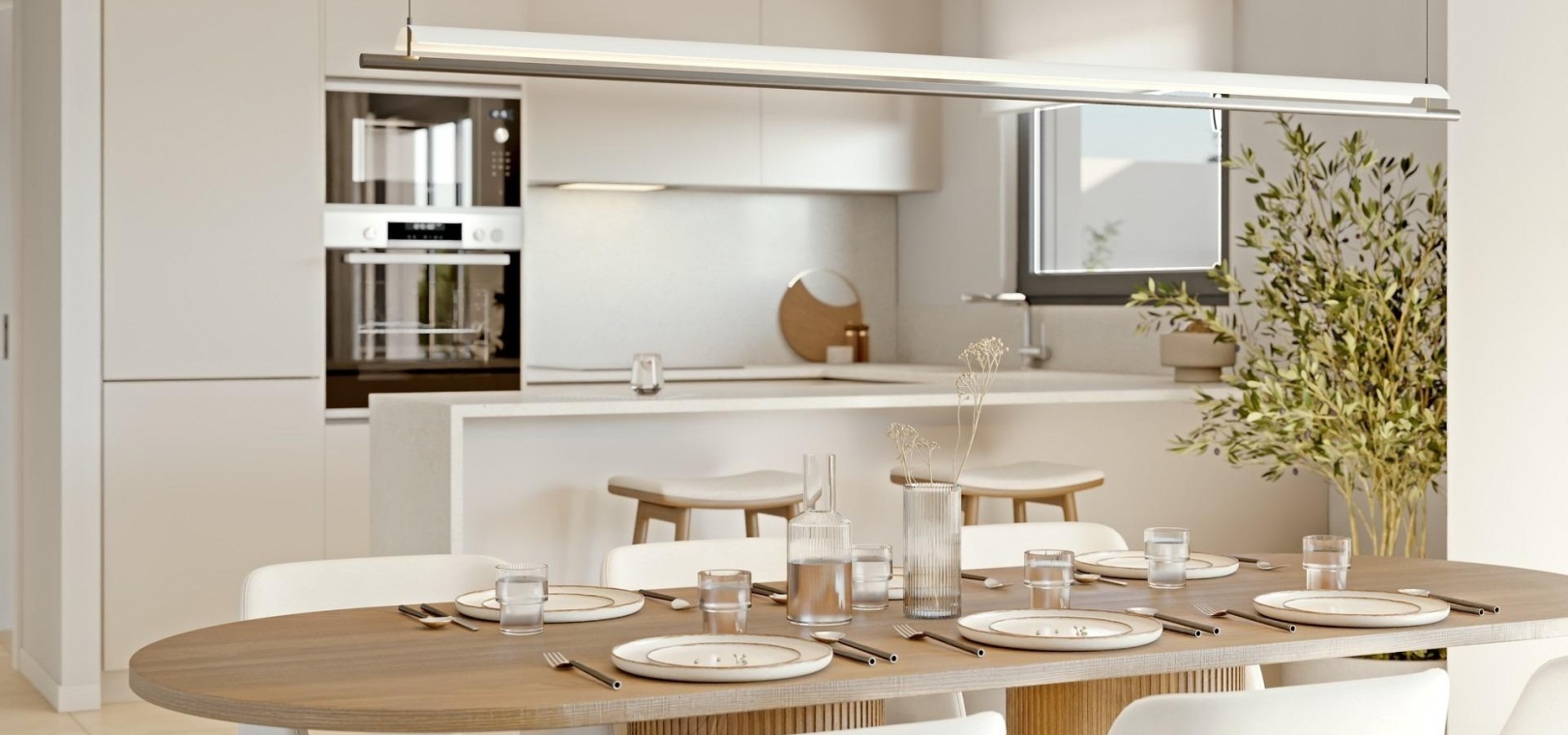 This development features two- and three-bedroom apartments in low-rise buildings of up to five floors, all thoughtfully oriented to maximize natural light and park views. Each unit is designed to seamlessly connect indoor and outdoor spaces with spacious terraces and glass balustrades. The interiors emphasize modern living, with open-plan layouts and fully-fitted kitchens featuring quartz countertops and Bosch appliances. The complex integrates eco-friendly solutions, including photovoltaic panels, aerothermal systems, and efficient water fixtures for sustainability without sacrificing comfort.