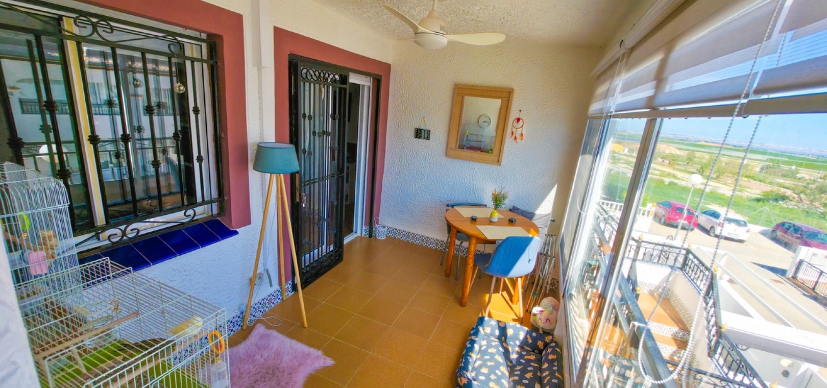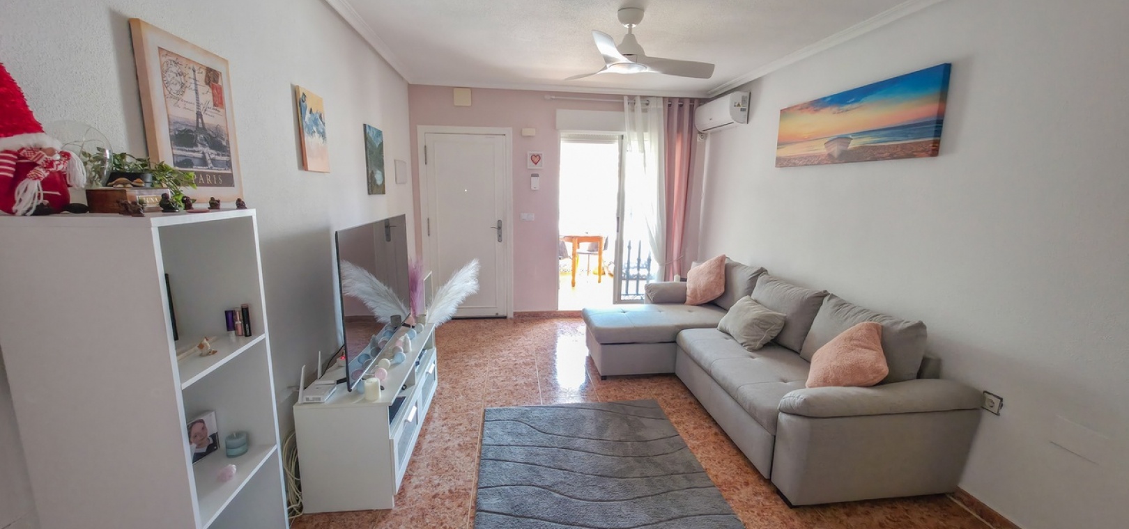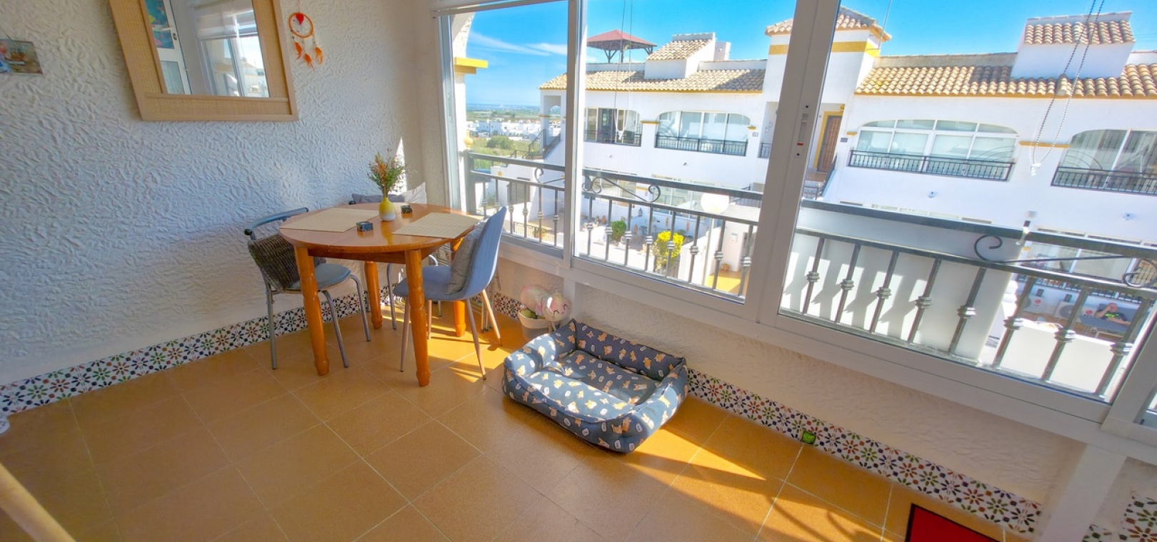 Flooded with natural light throughout the day, the property offers a bright and contemporary living space. Inside, you’ll find a spacious lounge with air conditioning for year-round comfort, and a stylish fully equipped kitchen positioned to the rear. Patio doors lead out to a glazed terrace—an ideal spot for dining, relaxing, or enjoying the sunshine.