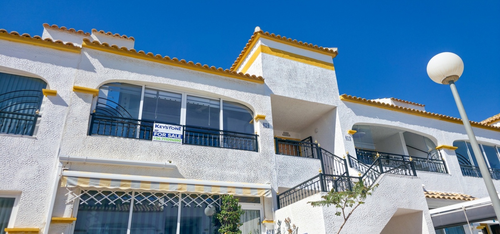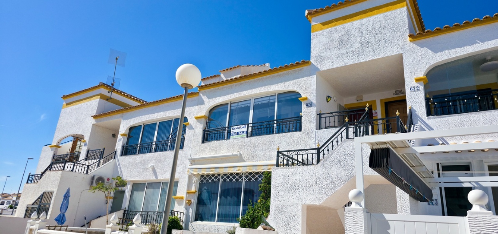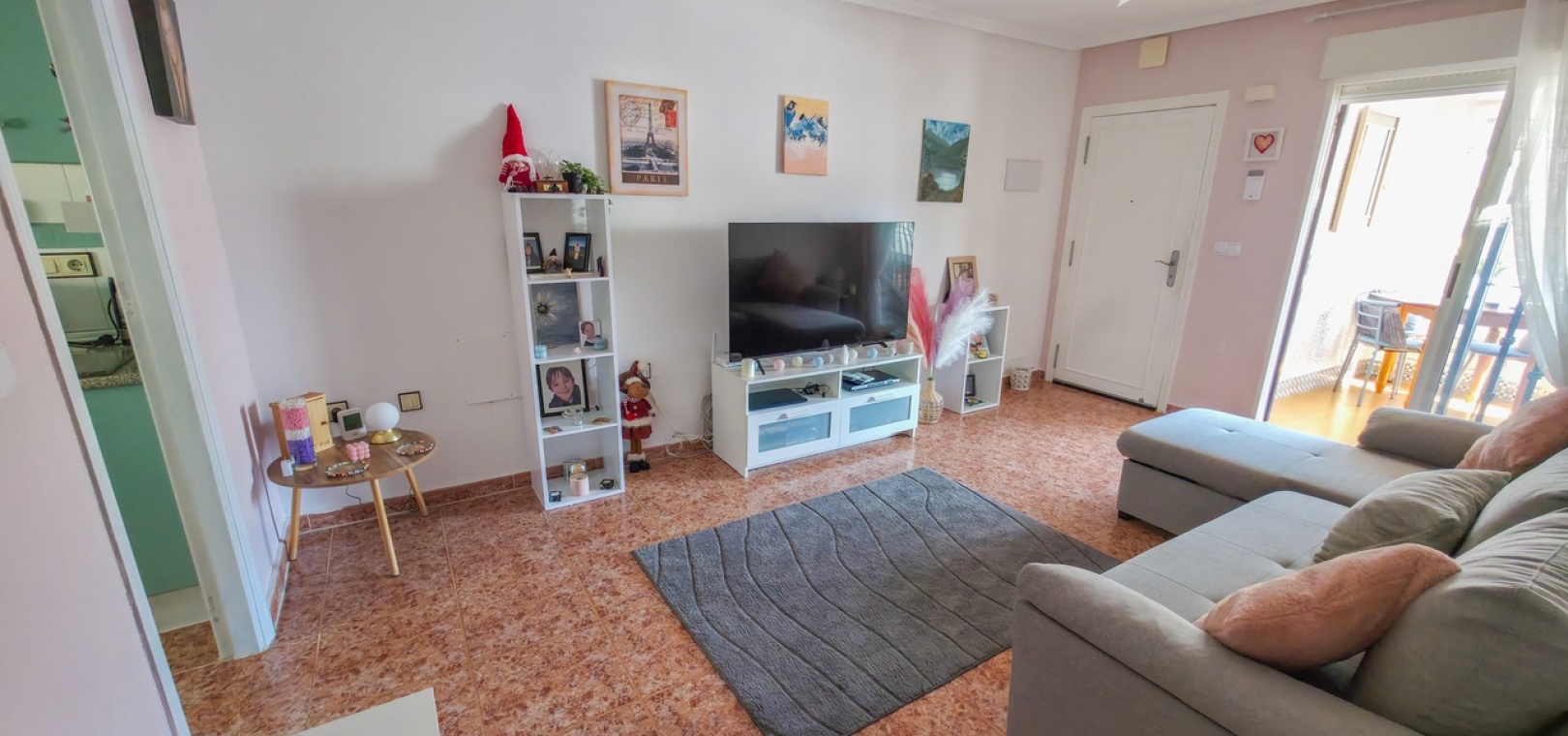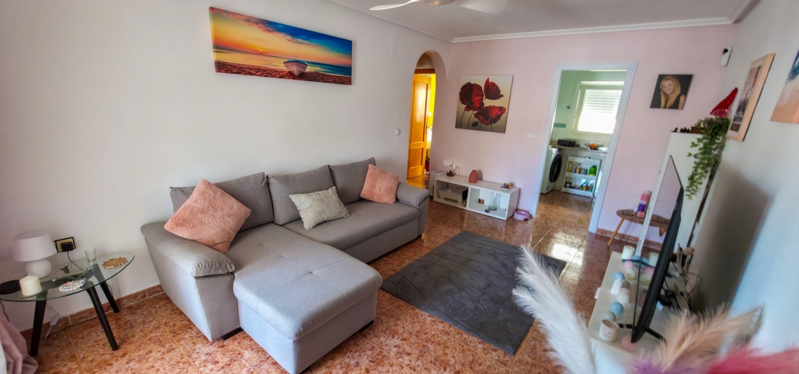 Flooded with natural light throughout the day, the property offers a bright and contemporary living space. Inside, you’ll find a spacious lounge with air conditioning for year-round comfort, and a stylish fully equipped kitchen positioned to the rear. Patio doors lead out to a glazed terrace—an ideal spot for dining, relaxing, or enjoying the sunshine.