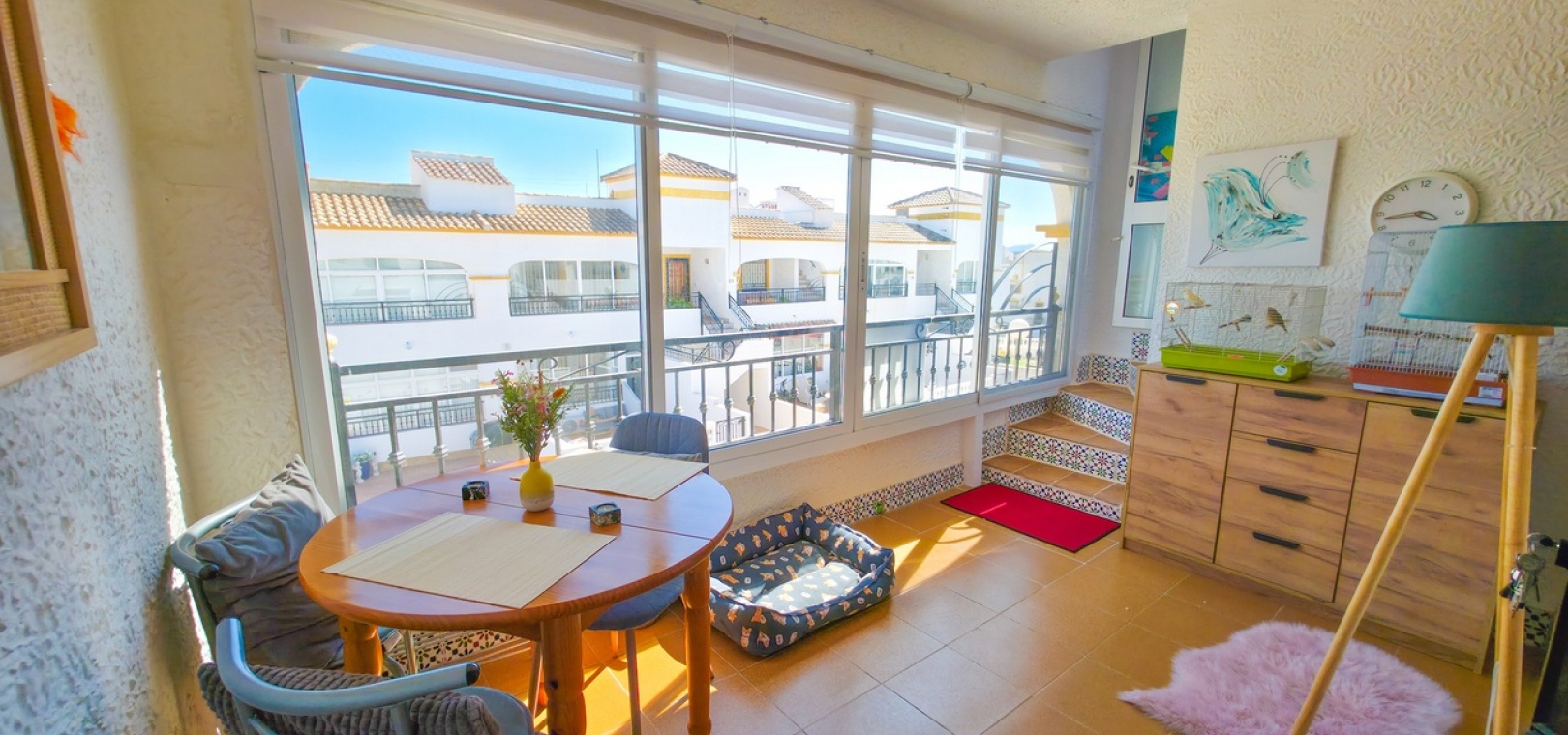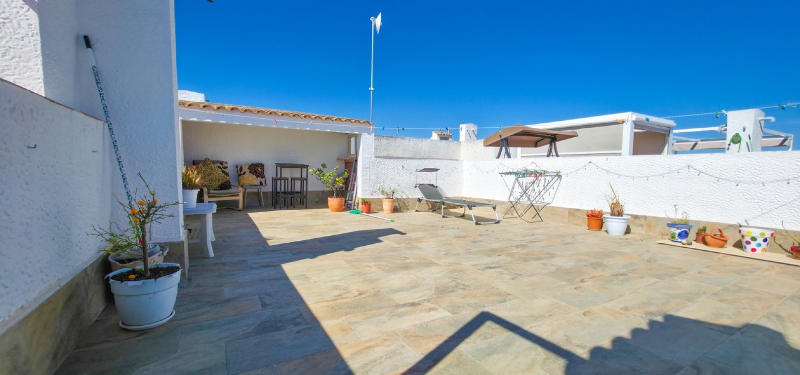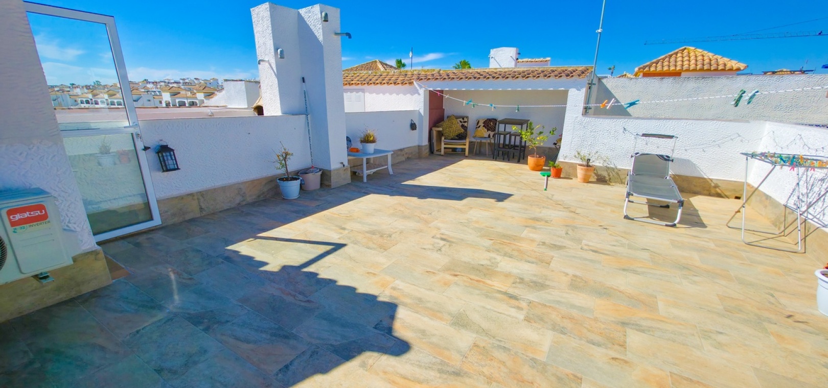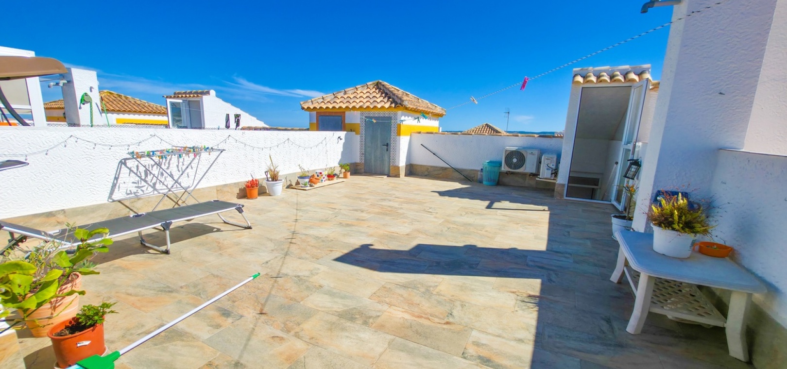 The standout feature is the private rooftop solarium, accessed via internal stairs from the terrace. This generous outdoor space offers open panoramic views and is perfect for sunbathing, entertaining, or unwinding after a day on the nearby Vistabella Golf Course. The solarium also includes a useful storage room and some outdoor furniture.