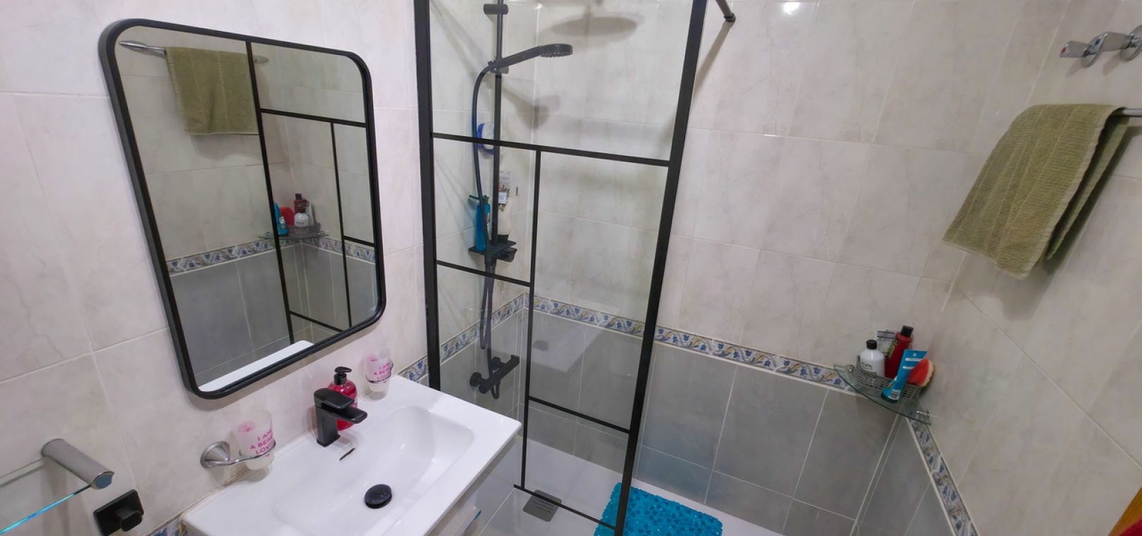 The apartment features two double bedrooms with fitted wardrobes, including a master bedroom with air conditioning. A modern family bathroom with a recently installed walk-in shower is conveniently located between the bedrooms.