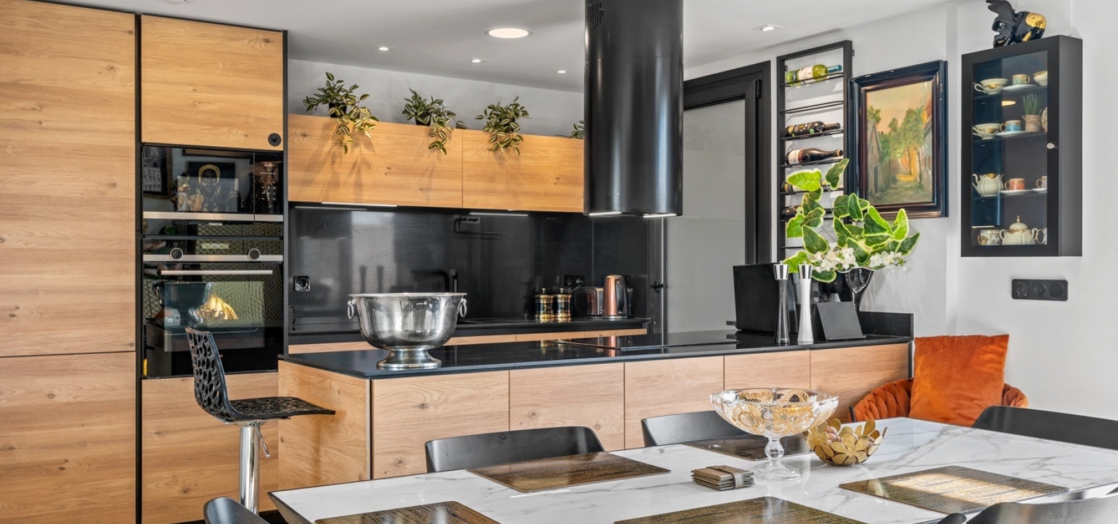 From the living area, direct access leads to a generous terrace suited for outdoor dining. The upper level introduces an additional terrace complete with an outdoor kitchen, barbecue, and dining area—an ideal setting for entertaining.