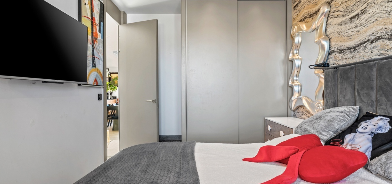 The apartment comprises three spacious bedrooms, all with built-in wardrobes. The principal bedroom and a second bedroom benefit from direct access to private terraces or balconies, enhancing comfort and usability. There are two modern bathrooms, including one en-suite, finished in a contemporary style.
