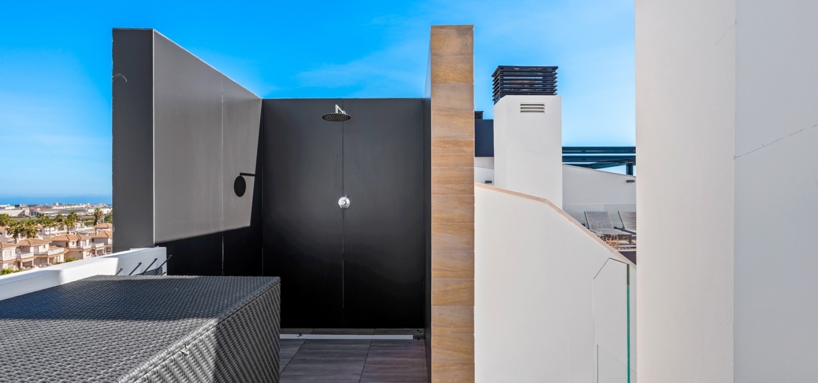 At the top, the expansive rooftop terrace serves as a standout feature. This private space includes a jacuzzi, lounge area, and sunbathing zones, offering open panoramic views extending towards the coastline. It is designed for both daytime relaxation and evening use.