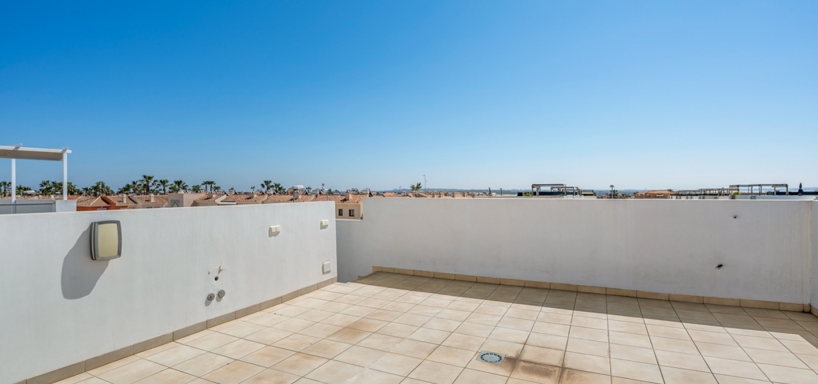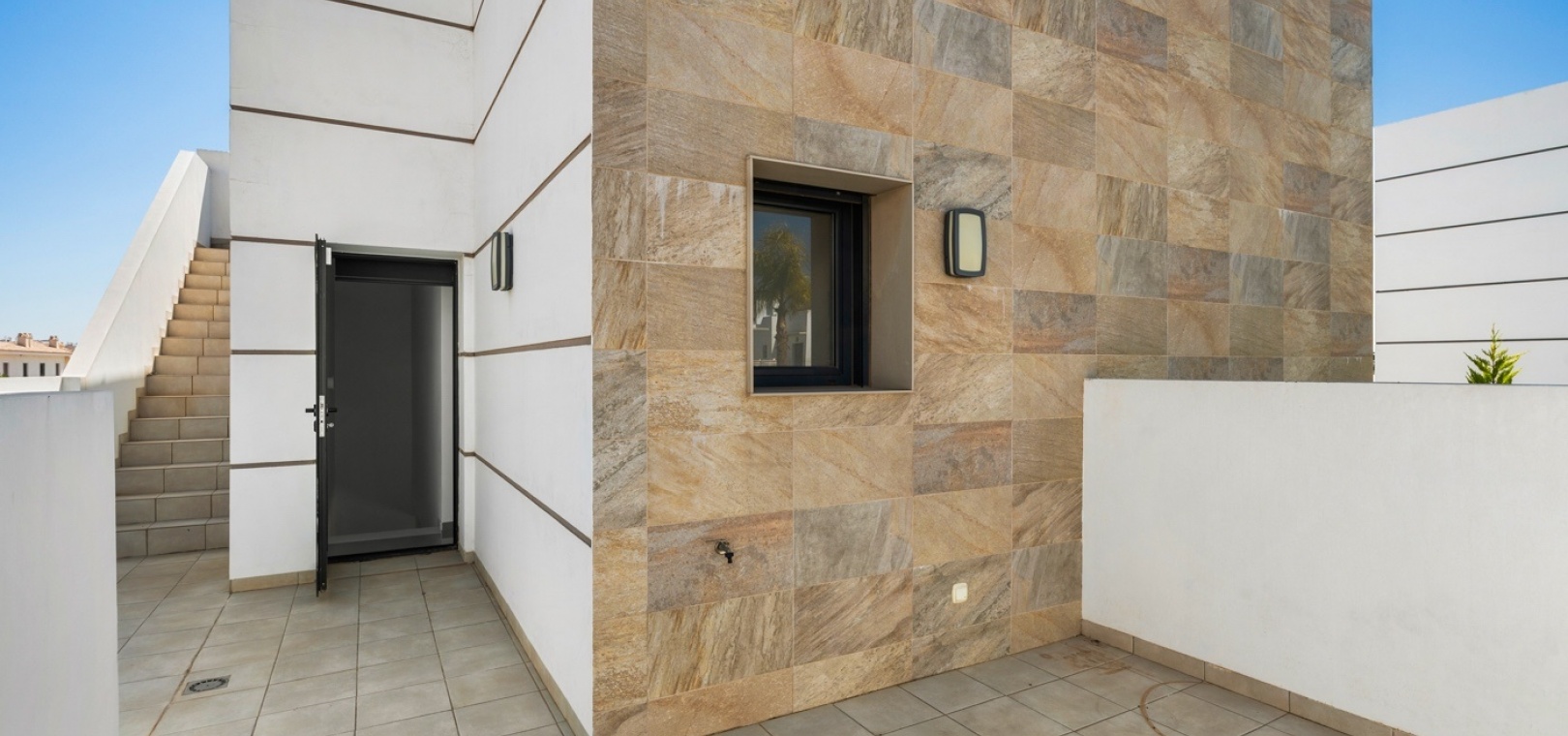 The upper level comprises two additional double bedrooms, both with en-suite bathrooms. The master suite benefits from a walk-in wardrobe, while the remaining bedroom includes built-in wardrobes. This floor also provides access to a generous terrace, which connects to a rooftop solarium.