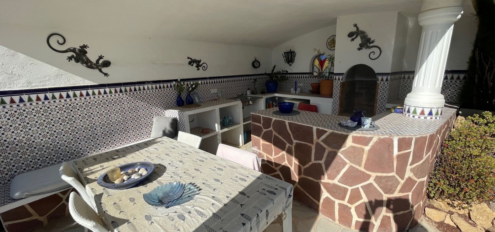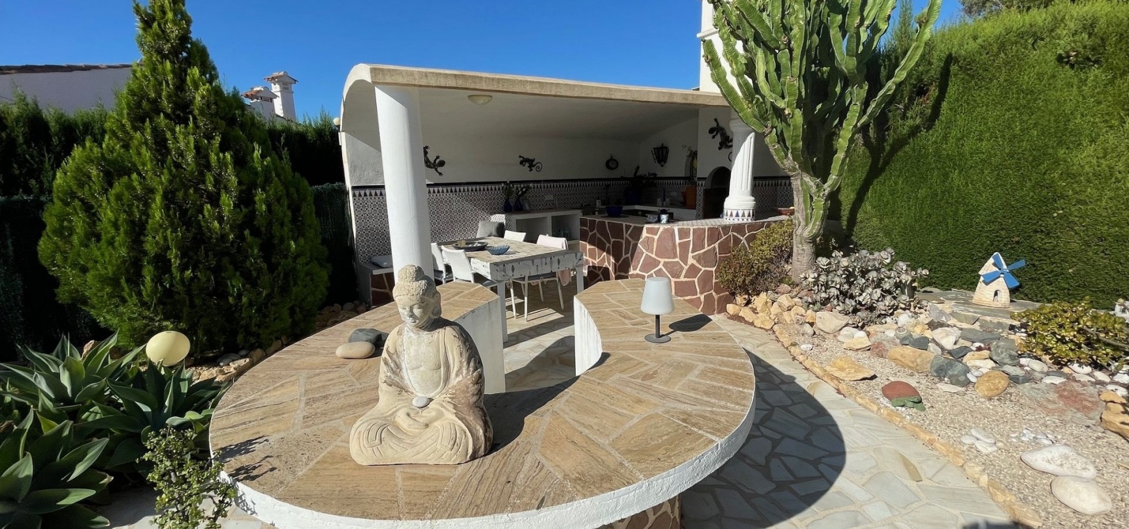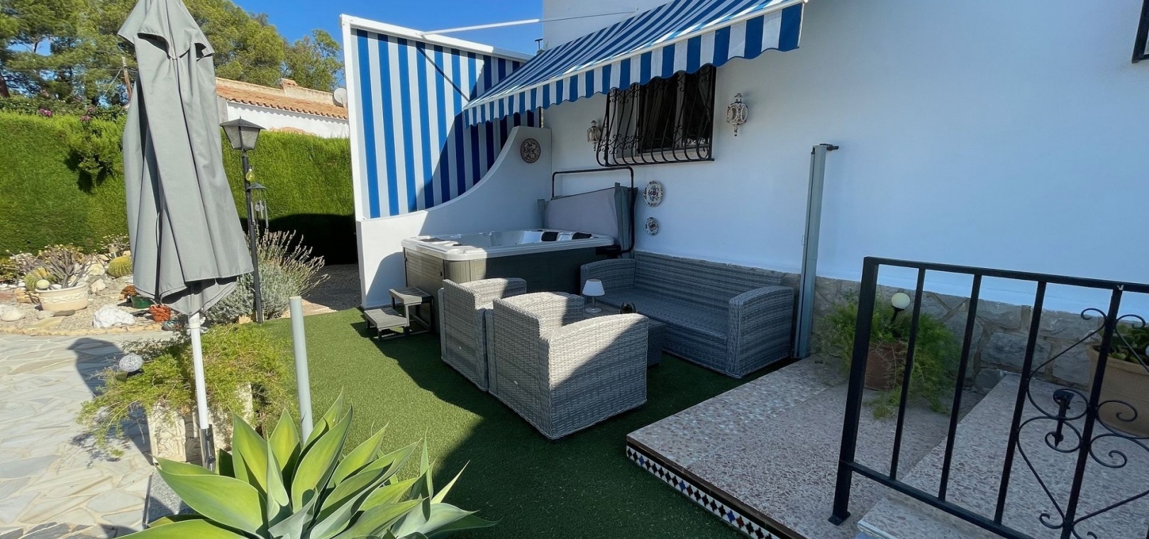 The beautiful garden surrounds the house and offers several cosy seating areas, a jacuzzi and a spacious outdoor kitchen.