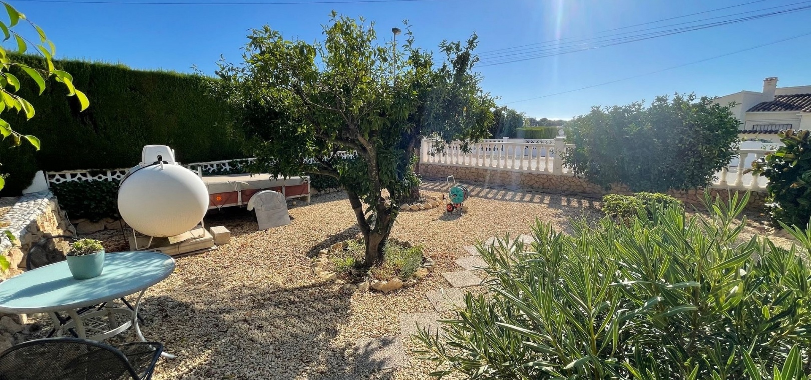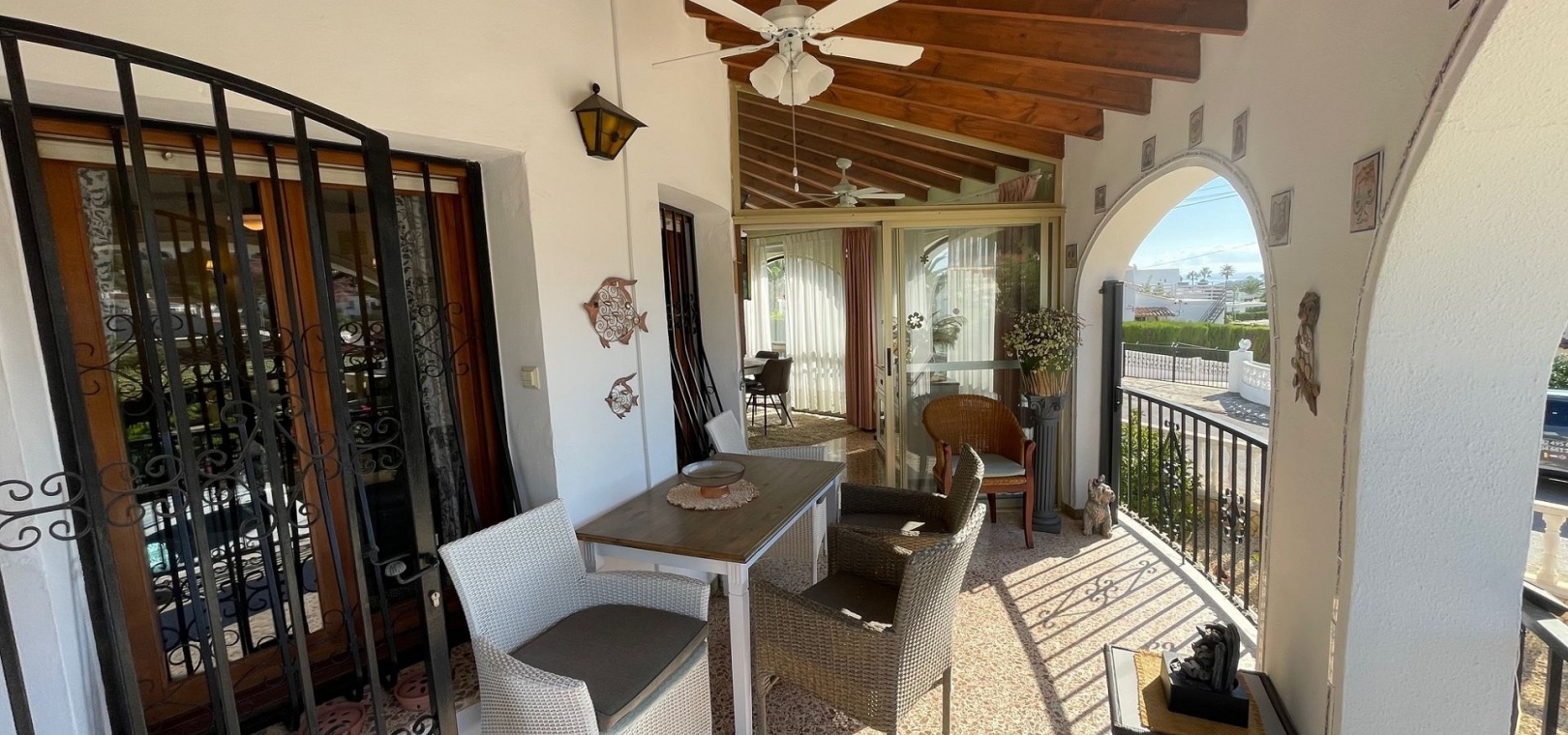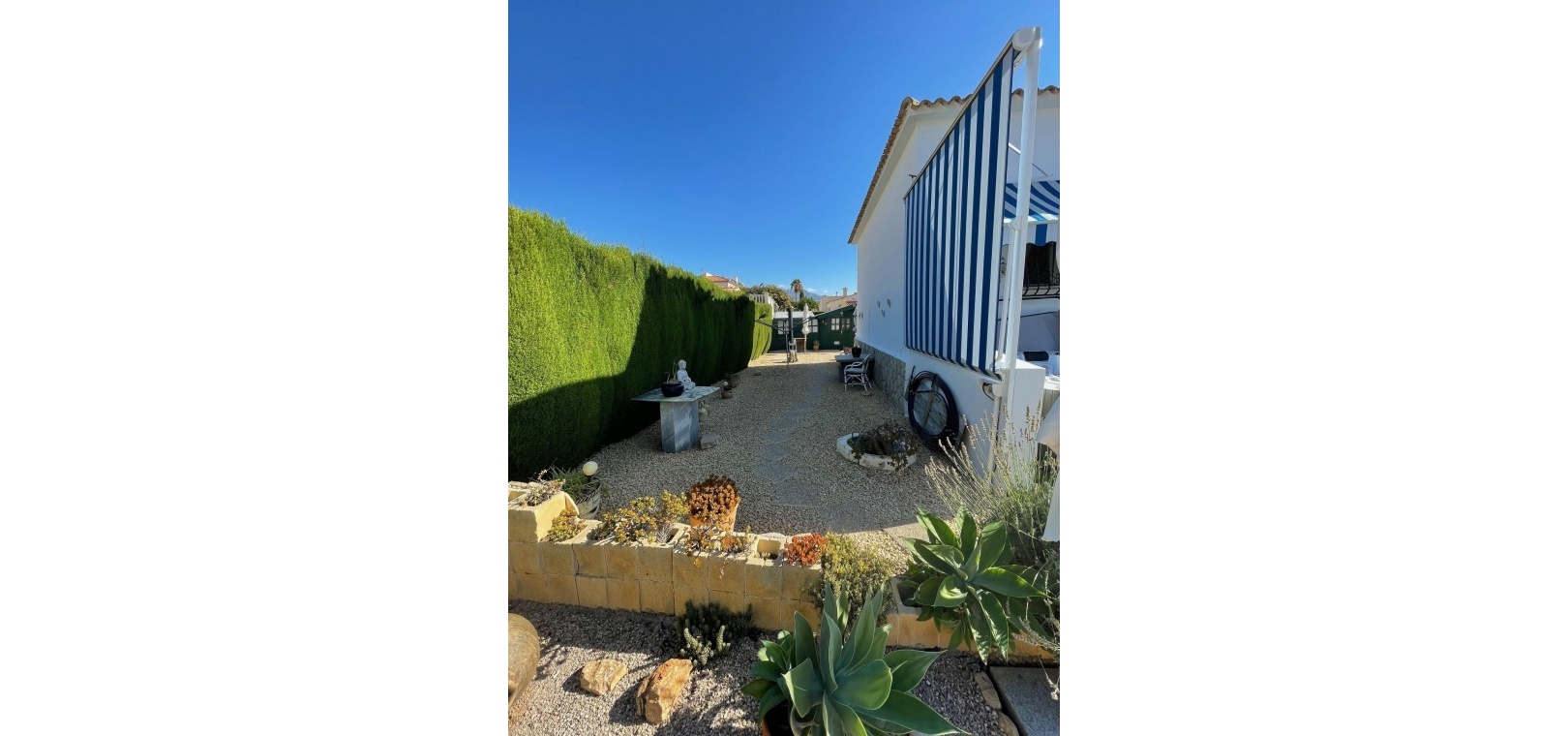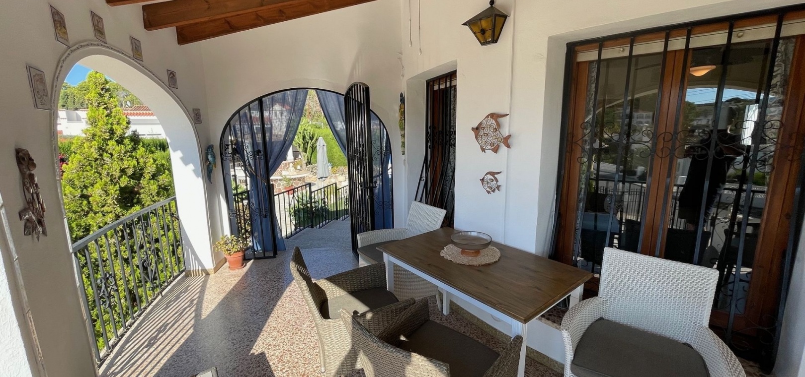 The villa has a large terrace, part of which has been enclosed to create additional living space. You are welcomed by a spacious open-plan living room with a generous dining area – perfect for dinners and socialising with family and friends. The practical kitchen is equipped with plenty of storage space and worktops – perfect for those who love to cook. A hallway leads to the fully renovated bathroom (with shower) and two spacious bedrooms.