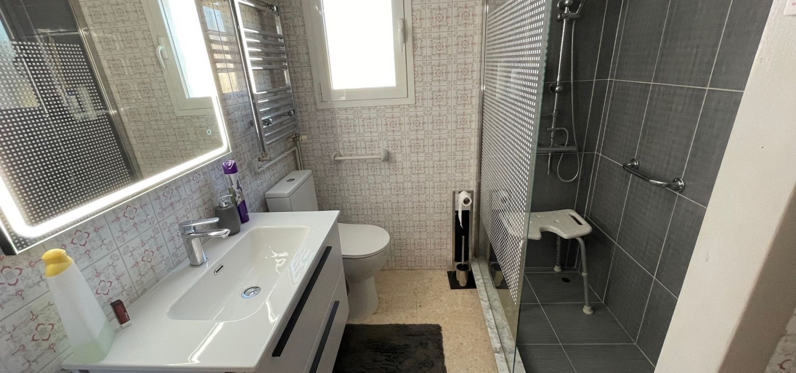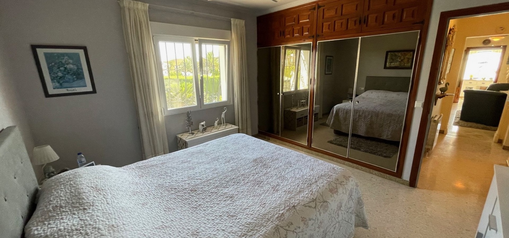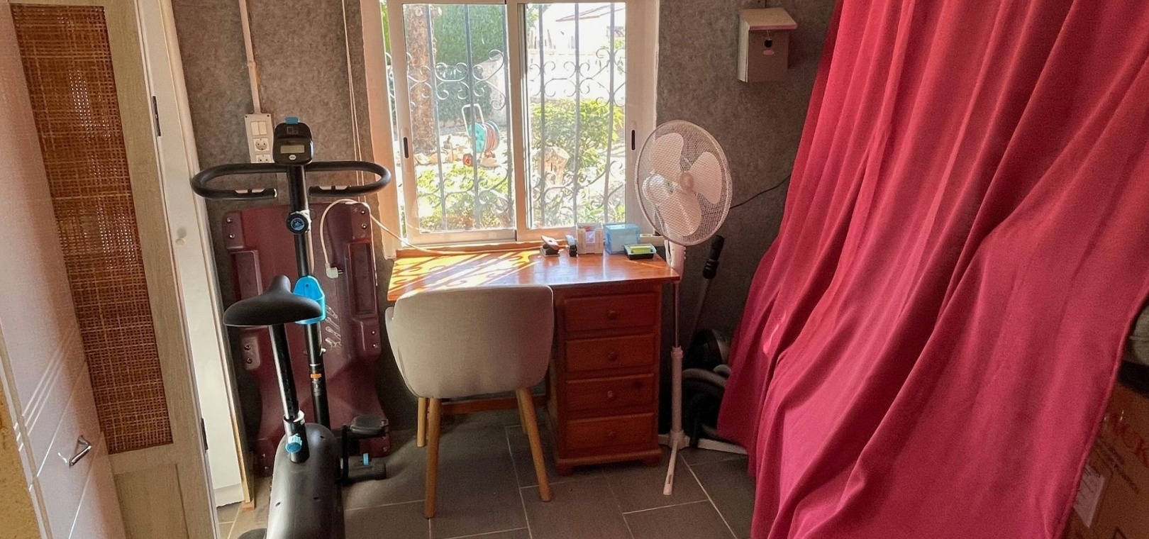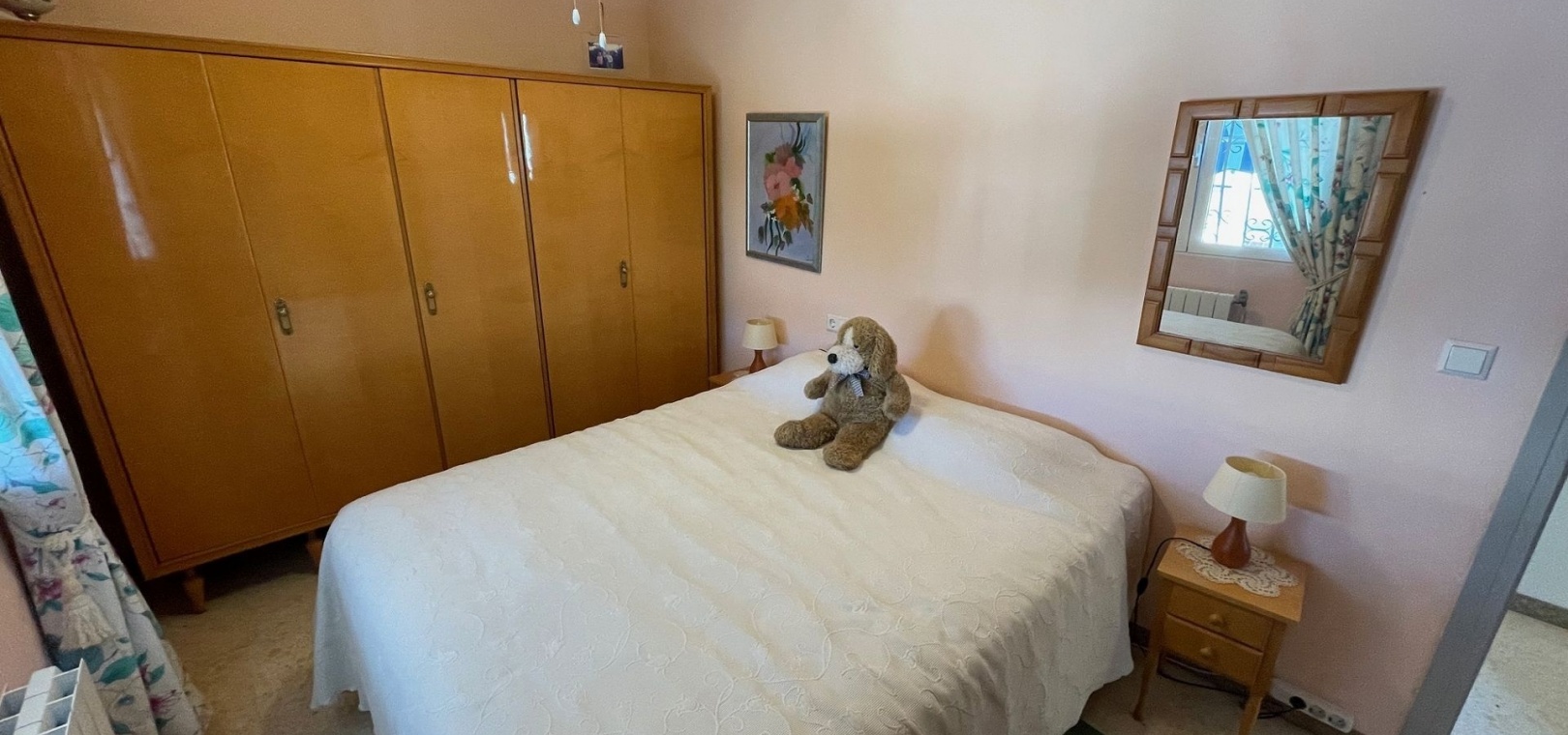 The villa has a large terrace, part of which has been enclosed to create additional living space. You are welcomed by a spacious open-plan living room with a generous dining area – perfect for dinners and socialising with family and friends. The practical kitchen is equipped with plenty of storage space and worktops – perfect for those who love to cook. A hallway leads to the fully renovated bathroom (with shower) and two spacious bedrooms.