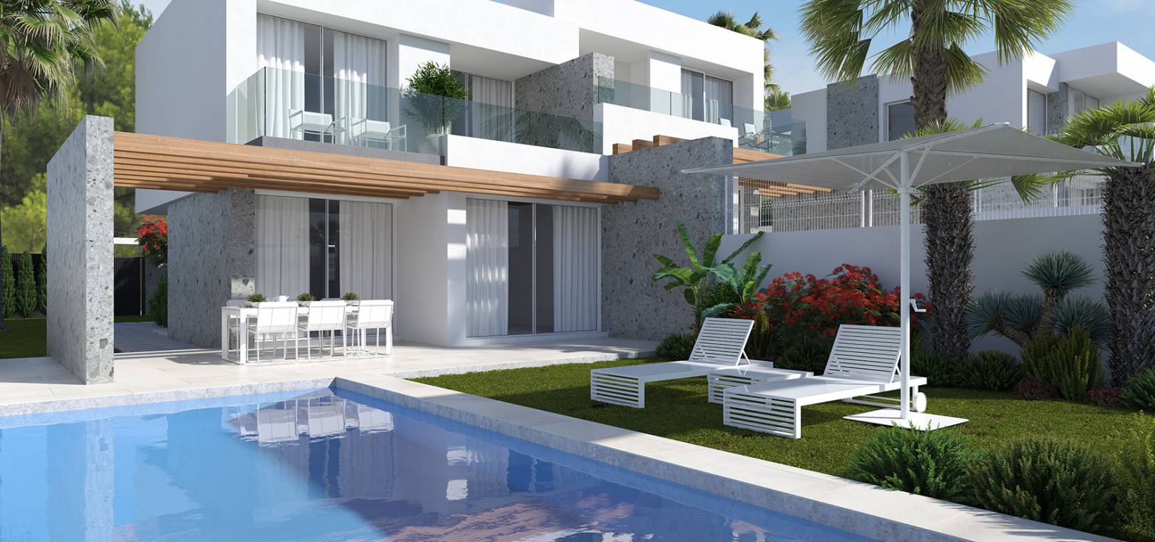 New Build Ultra Modern Design 3 bedroom, 3 bathroom luxury semi detached houses with private swimming pools located in Res. Coral Village, Finestrat, Costa Blanca.