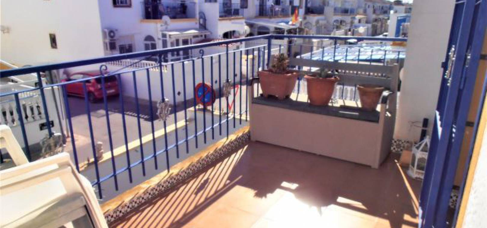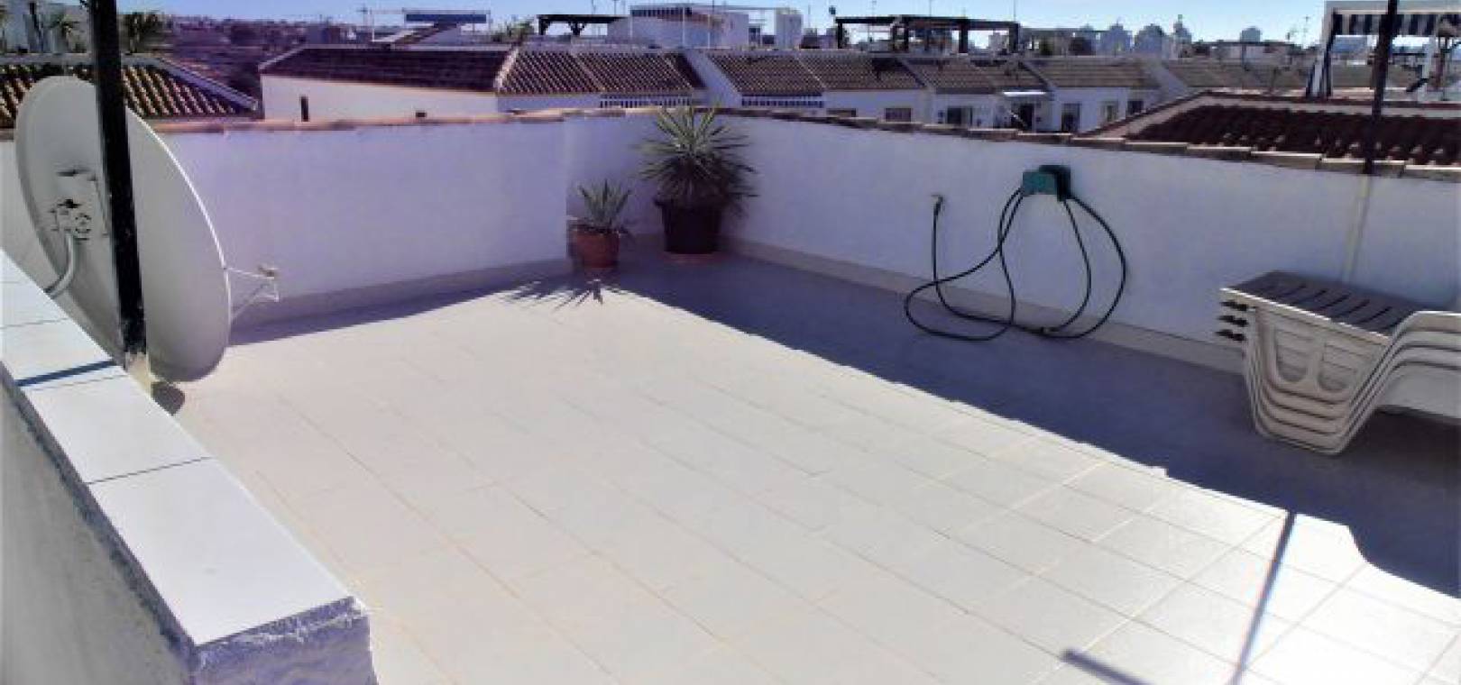 A 2 bed 1 bath top floor apartment with a 60m2 private rooftop solarium located in Jardin del Mar V, Torrevieja, Costa Blanca.