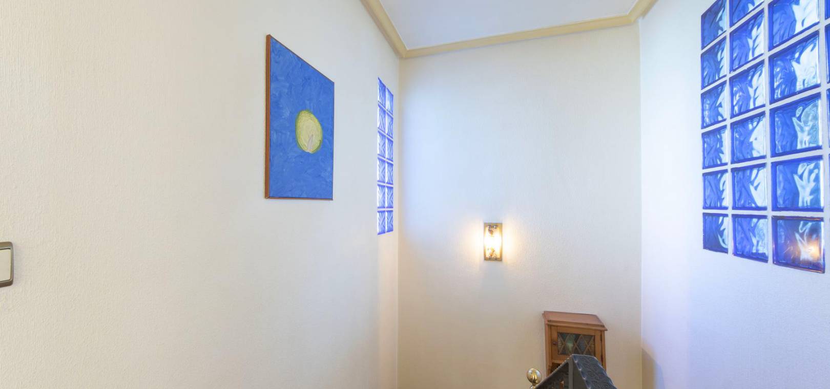 An internal staircase leads up to the 1st floor where there is a double bedroom with fitted wardrobes, hot and cold A/C & a ceiling fan & 1 x family bathroom.