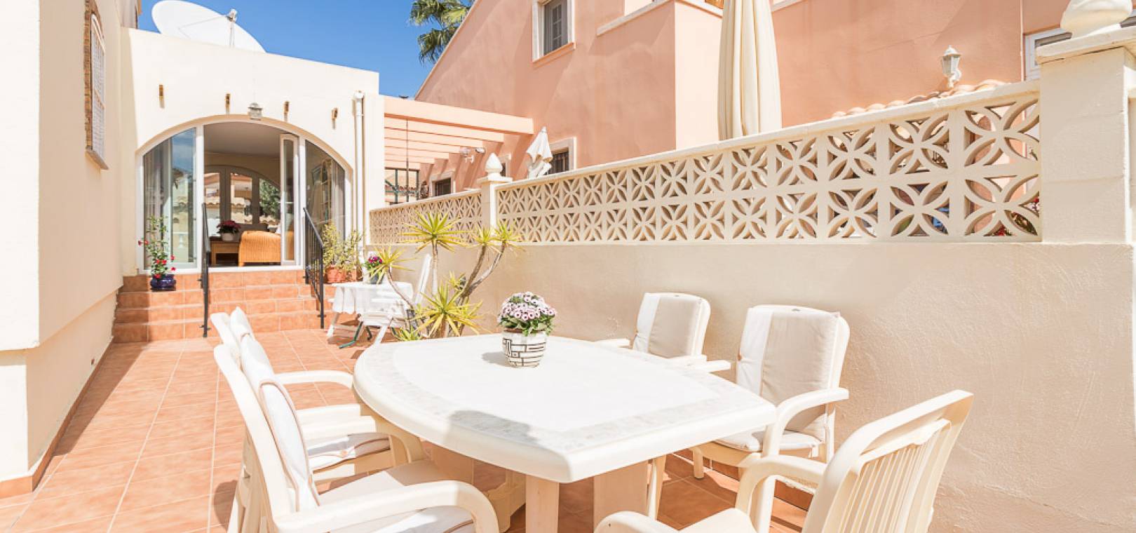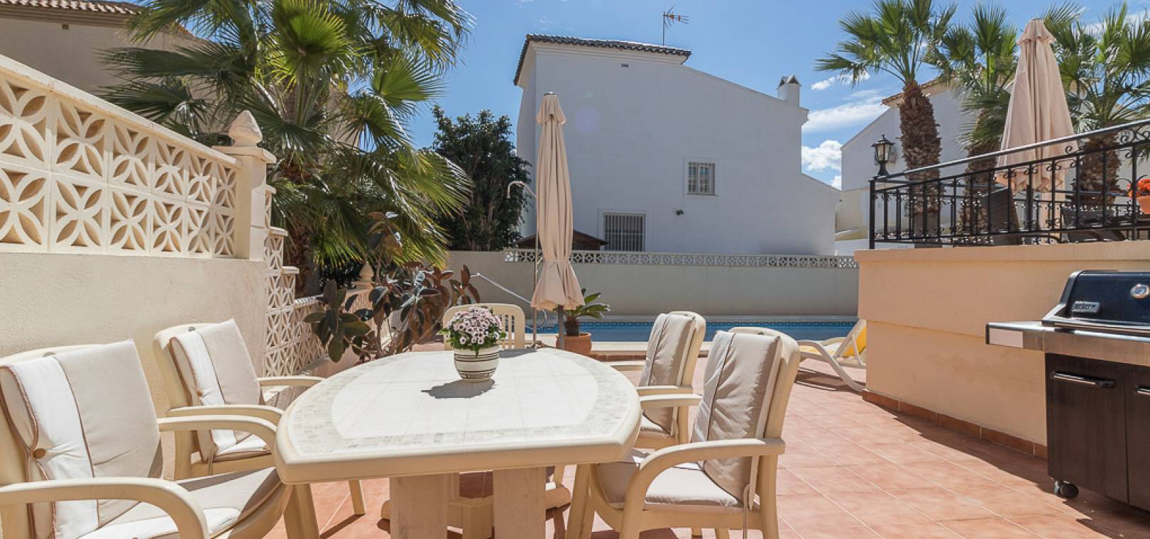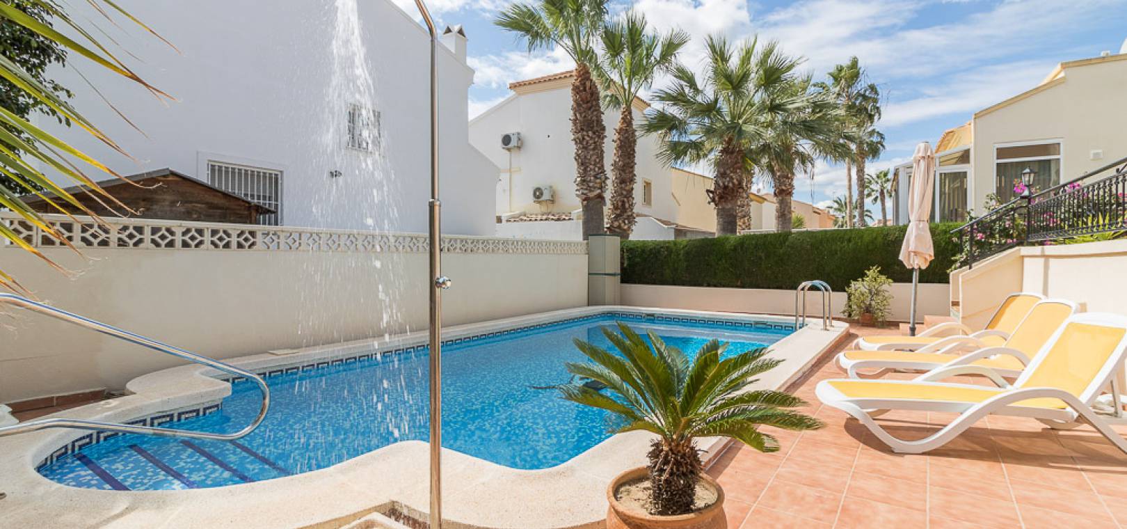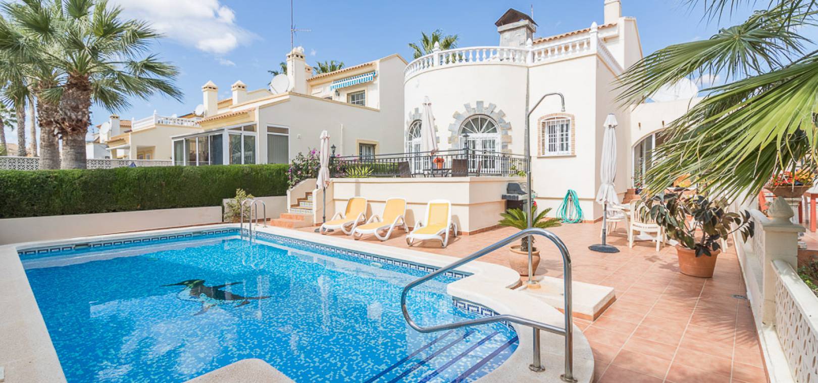 En söderläge 3 sovrum 2 badrum Ibiza stil fristående villa med en privat pool ligger i Res. Montila, Playa Flamenca, Costa Blanca. Virtuell visning tillgänglig på den här fastigheten! Denna rymliga fastighet byggd i Quara erbjuds till försäljning i mycket gott skick och består mycket kort av följande: - På bottenvåningen finns ett stort vardagsrum / matrum med en öppen spis, ett fullt utrustat kök med öppen planlösning, 2 x dubbel sovrum ett med en härlig sunroom av det dubblar upp som ett fjärde sovrum om du behöver utrymme & den andra har varm och kall A / C & 1 x nyligen monterade duschrum. På första våningen finns det största sovrummet med eget badrum, varm och kall luftkonditionering och solig söderläge privat terrass. Utanför finns en låg underhållsträdgård med privat pool, solig terrass, en uppfart för terrängparkering och mycket mer. Denna ljuvliga fastighet ligger bara några minuters promenad till många barer, butiker, restauranger, stormarknader etc. Playa Flamenca Saturday street market, Zenia Boulevard köpcentrum och havet ligger runt 15 till 20 minuters promenad bort. Alicantes flygplats ligger cirka 50 minuters bilresa.