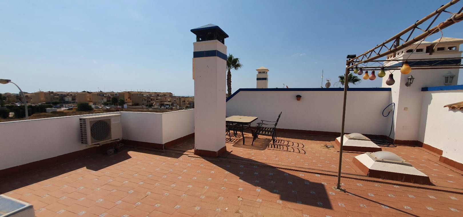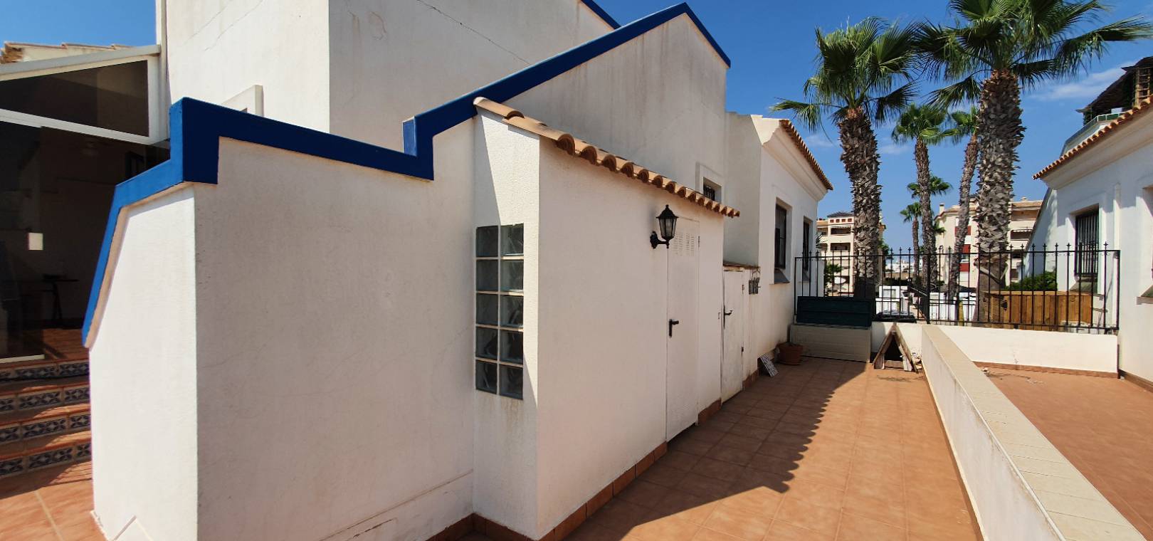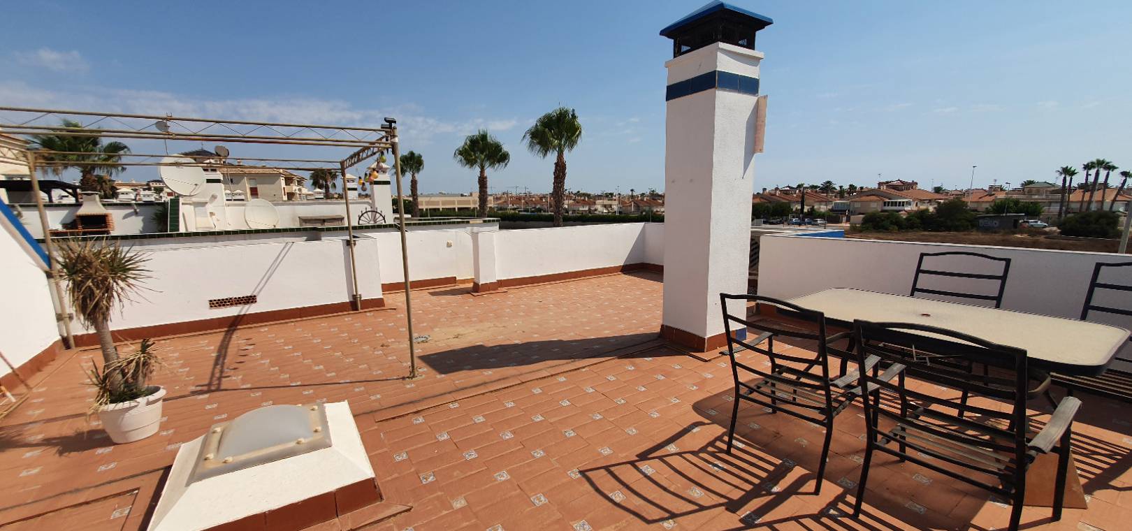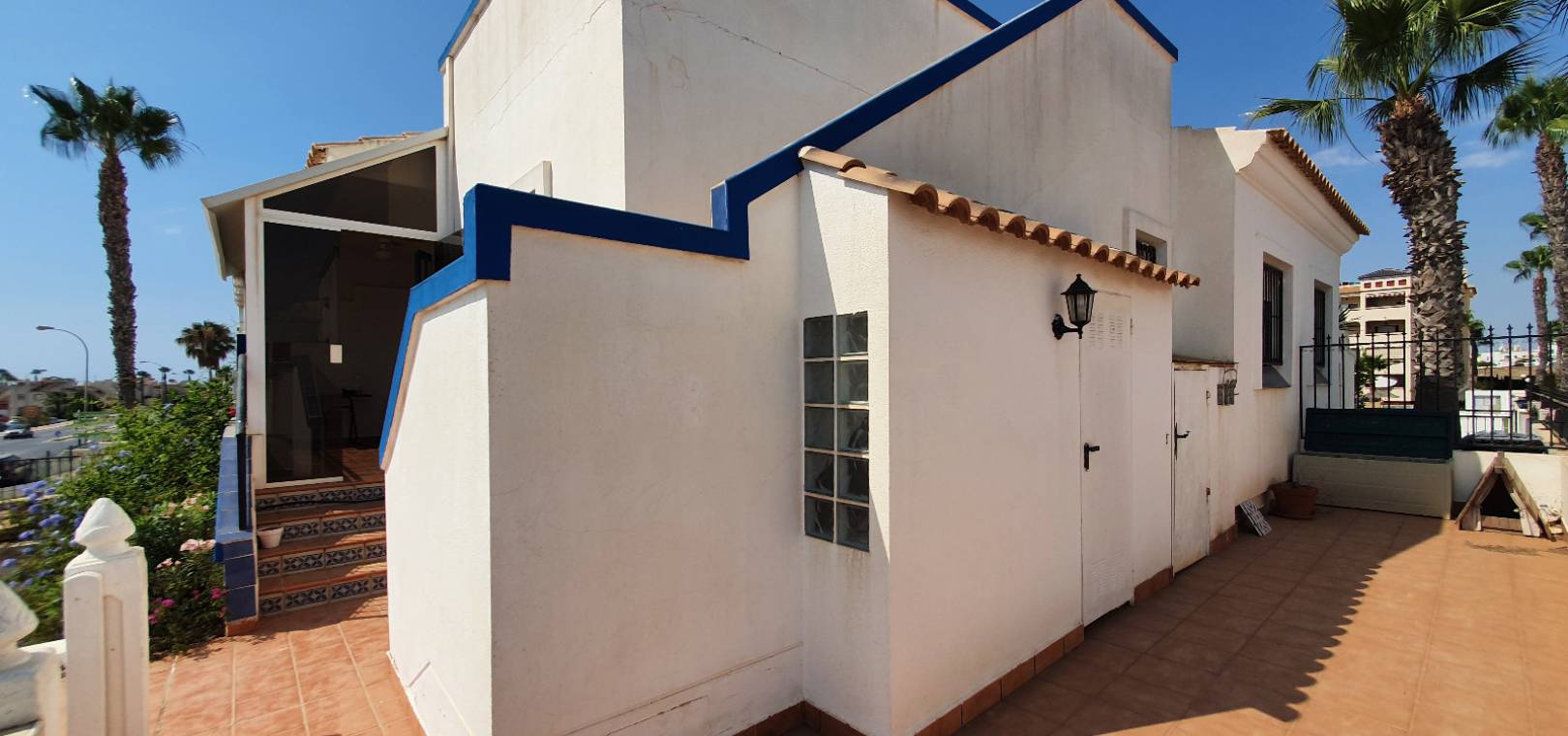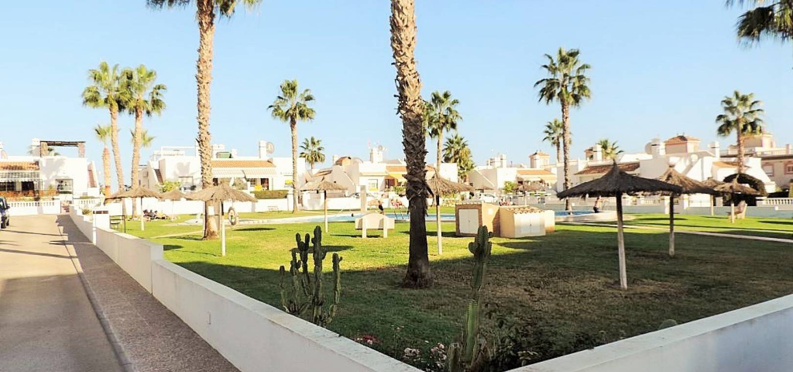 En österläge 2 sovrum 2 badrum Lola stil bungalow med en privat takterrass ligger i Res Jumilla II, Playa Flamenca, Costa Blanca. Denna underbara fastighet erbjuds till salu i gott skick och består mycket kort av följande: - Vardagsrum / matrum med en öppen spis, varm och kall luftkonditionering, ett separat kök, 2 x dubbelrum med inbyggda garderober, det största sovrummet har eget duschrum och 1 x familjebadrum. Utanför finns en täckt och glaserad terrass, privat takterrass, helkaklat trädgård och sidoträdgård med bilport och en gemensam pool. Den här fastigheten ligger bara några minuters promenad från Playa Flamenca Commercial Center där du hittar många stormarknader, butiker, barer och restauranger etc. Vackra gyllene sandblå flaggstränder finns i närheten av Playa Flamenca-stranden och även vid Punta Prima, La Zenia och Cabo Roig. Det finns också en bra busservice (var 30: e minut), som länkar området med alla de viktigaste kustområdena som Torrevieja och Alicante till norr och Cartagena och Mar Menor i söder. Shopping: köpcentret Zenia boulevard ligger mindre än 5 minuters bilresa från fastigheten. Murcia International Corvera flygplats ligger 35 minuters bilresa och Alicante flygplats ligger 50 minuters bilresa.