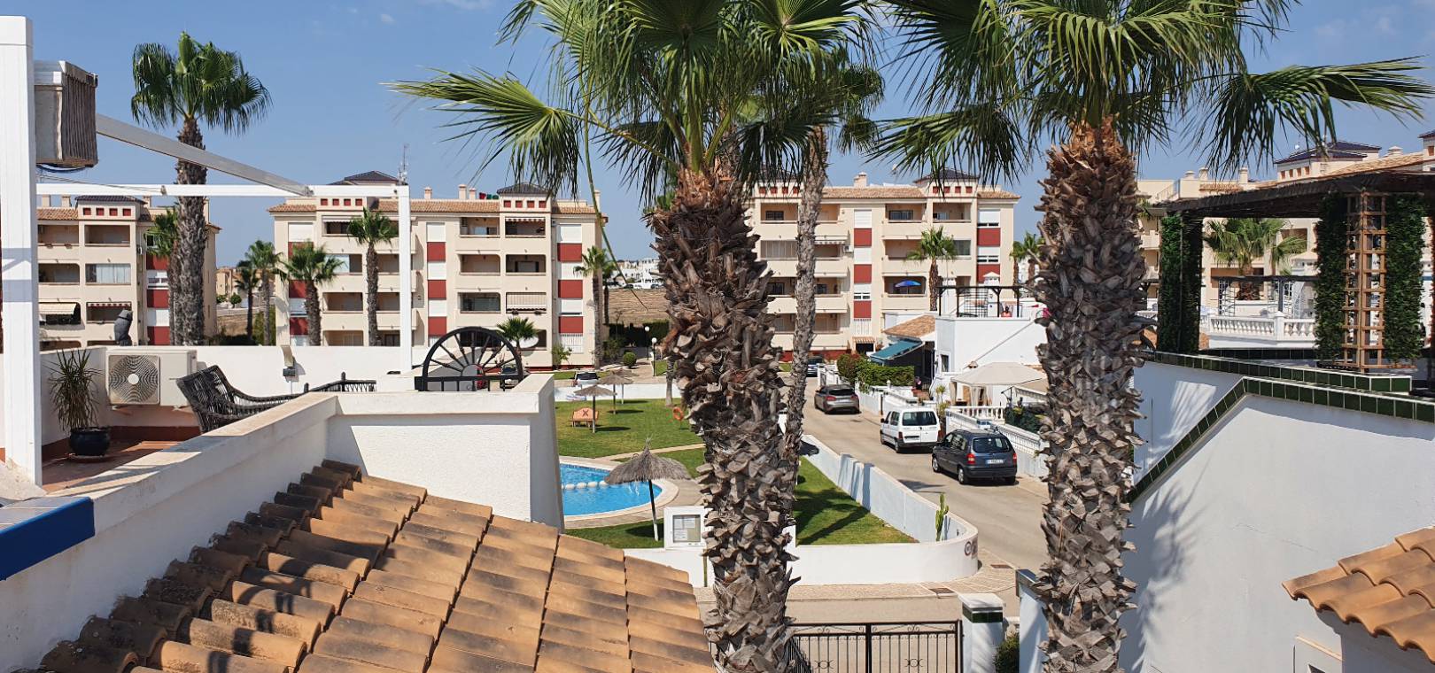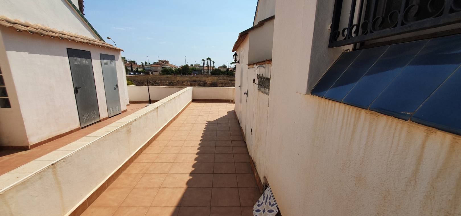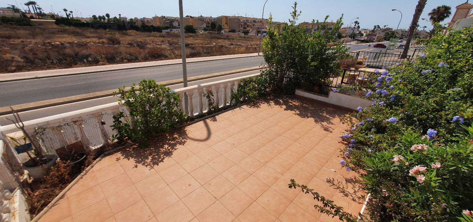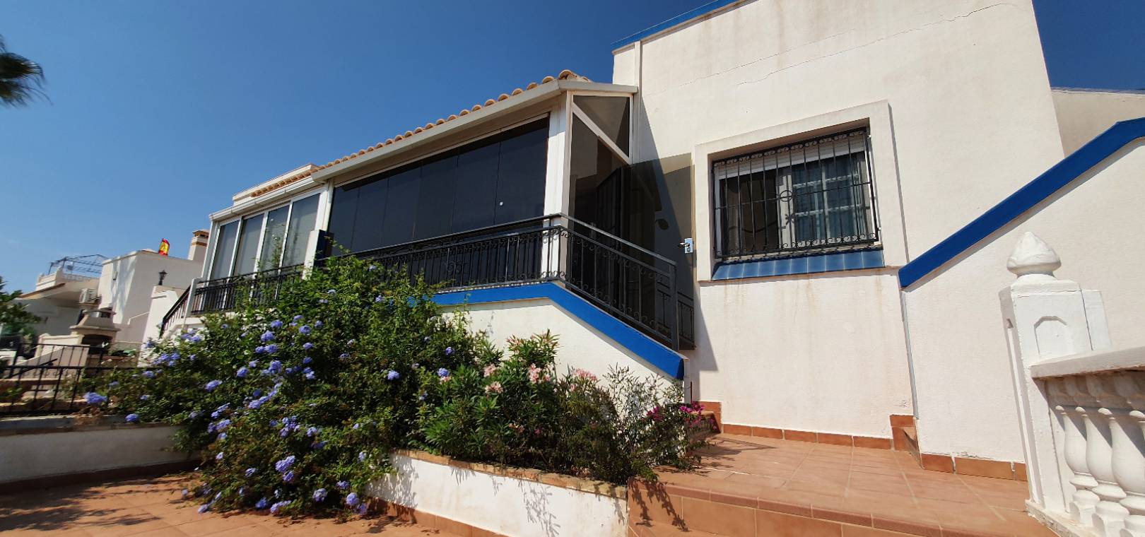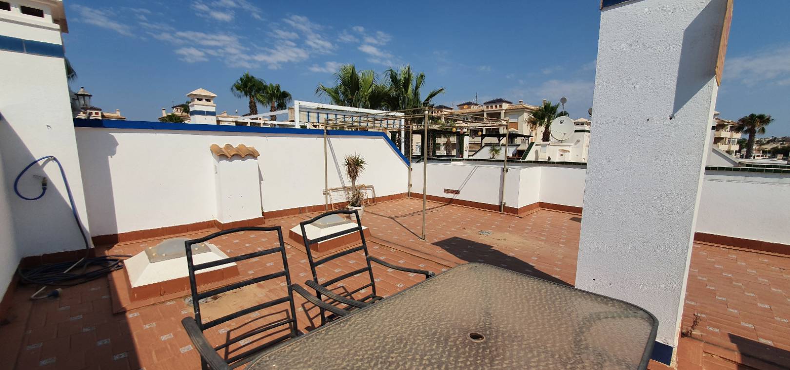 En österläge 2 sovrum 2 badrum Lola stil bungalow med en privat takterrass ligger i Res Jumilla II, Playa Flamenca, Costa Blanca. Denna underbara fastighet erbjuds till salu i gott skick och består mycket kort av följande: - Vardagsrum / matrum med en öppen spis, varm och kall luftkonditionering, ett separat kök, 2 x dubbelrum med inbyggda garderober, det största sovrummet har eget duschrum och 1 x familjebadrum. Utanför finns en täckt och glaserad terrass, privat takterrass, helkaklat trädgård och sidoträdgård med bilport och en gemensam pool. Den här fastigheten ligger bara några minuters promenad från Playa Flamenca Commercial Center där du hittar många stormarknader, butiker, barer och restauranger etc. Vackra gyllene sandblå flaggstränder finns i närheten av Playa Flamenca-stranden och även vid Punta Prima, La Zenia och Cabo Roig. Det finns också en bra busservice (var 30: e minut), som länkar området med alla de viktigaste kustområdena som Torrevieja och Alicante till norr och Cartagena och Mar Menor i söder. Shopping: köpcentret Zenia boulevard ligger mindre än 5 minuters bilresa från fastigheten. Murcia International Corvera flygplats ligger 35 minuters bilresa och Alicante flygplats ligger 50 minuters bilresa.