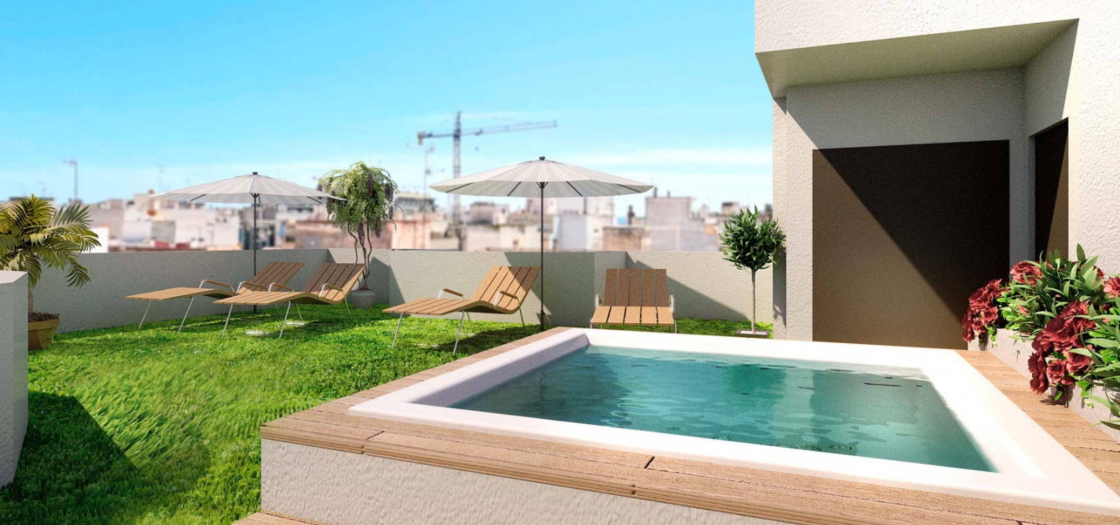 Det finns ett gemensamt takterrass med 2 x jacuzzi och solbad.