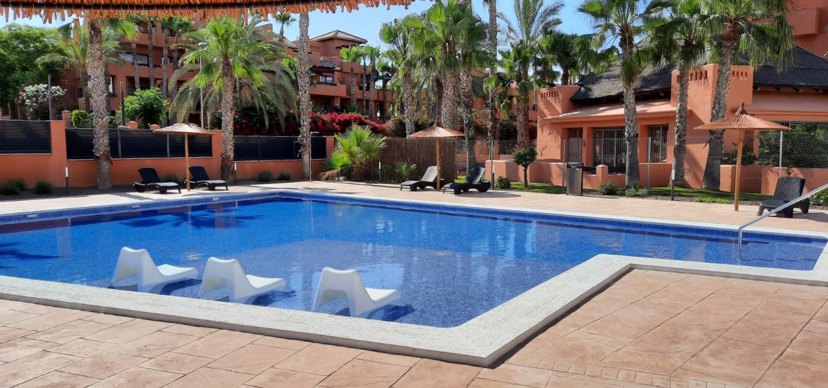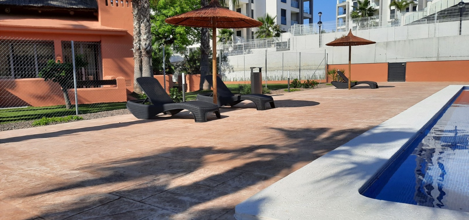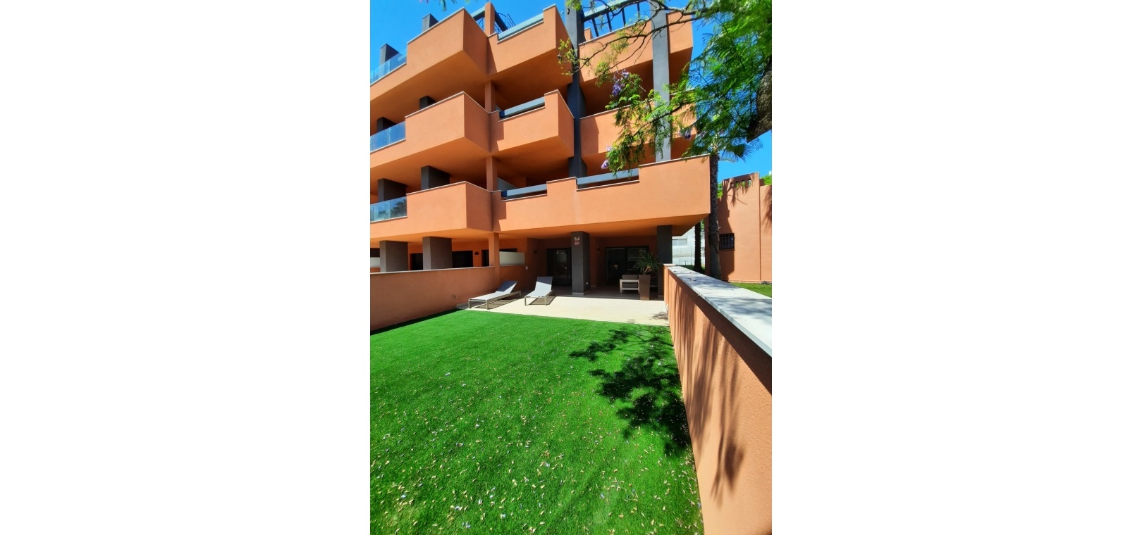 Fantastisk nyckelfärdig 2 sovrum 2 badrum lägenhet på bottenvåningen med en 300m2 trädgård belägen i Res. Palapa Golf, Villamartin, Costa Blanca South.