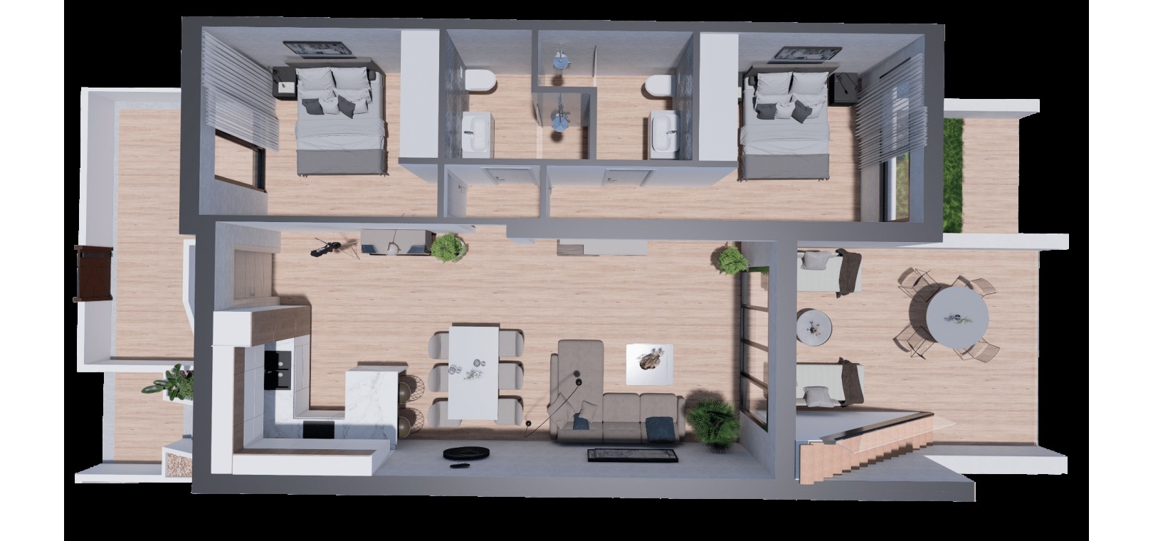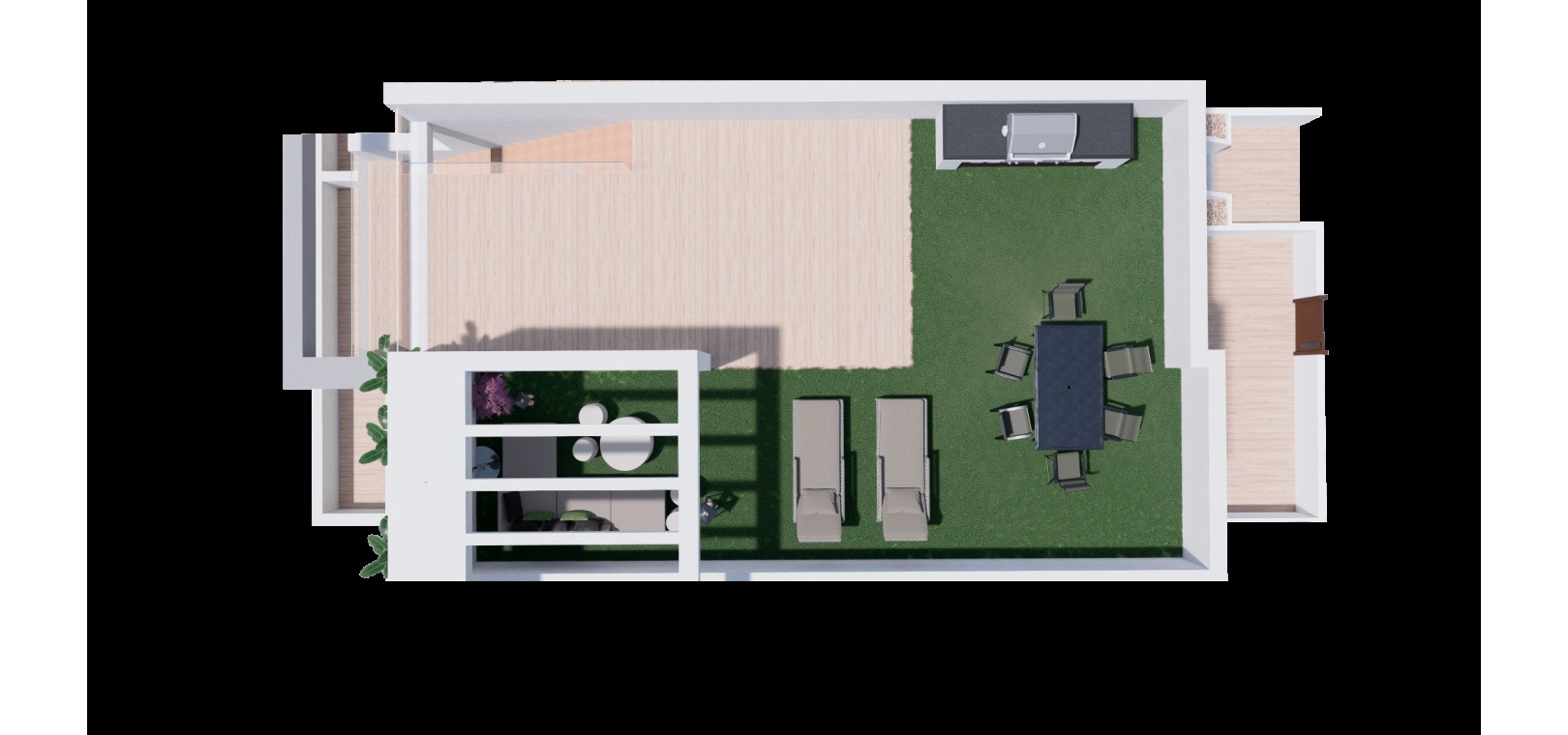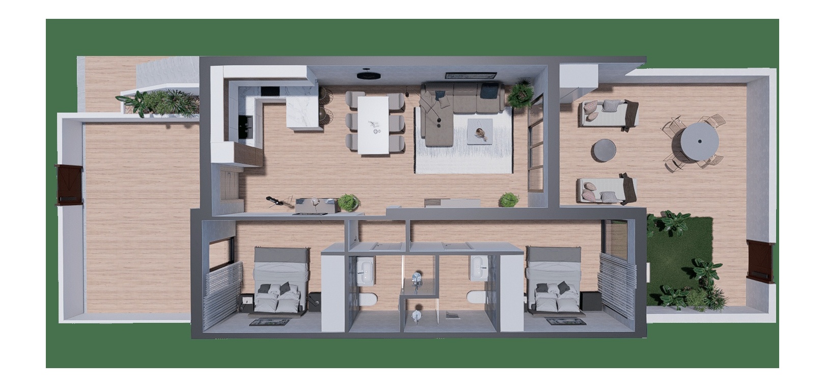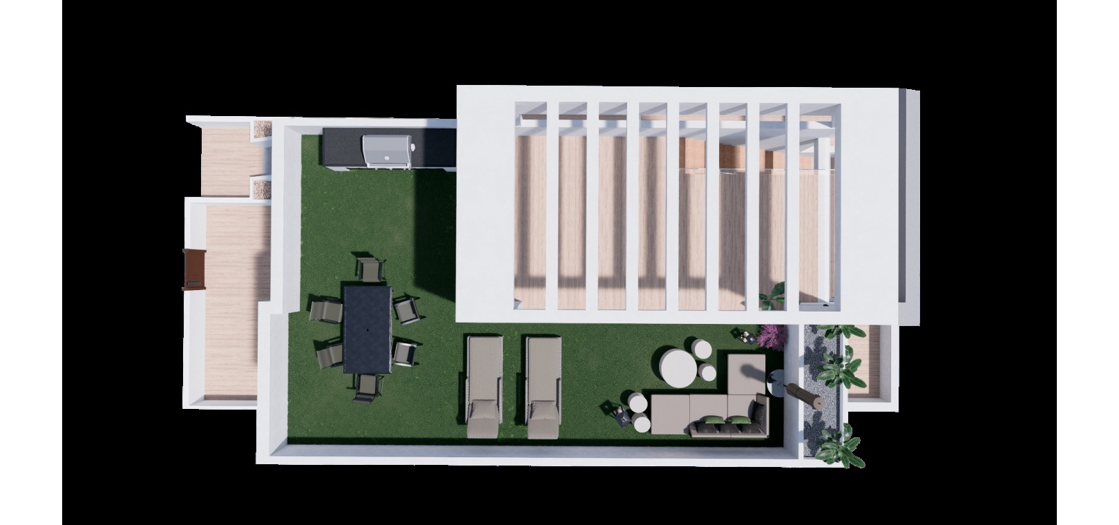 Vardagsrum, fullt utrustat kök med öppen planlösning, 2 x dubbelrum båda med inbyggda garderober, master med eget duschrum, 1 x familjebadrum, G/F terrass och trädgård eller balkong på 1:a våningen & 86m2 privat solarium, valfri underjordisk parkering med förråd, vackert designade gemensamma trädgårdar med 3 härliga gemensamma pooler och mycket mer.
