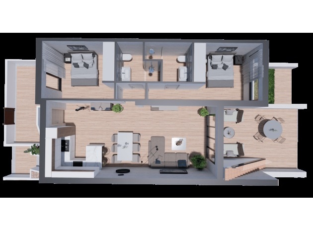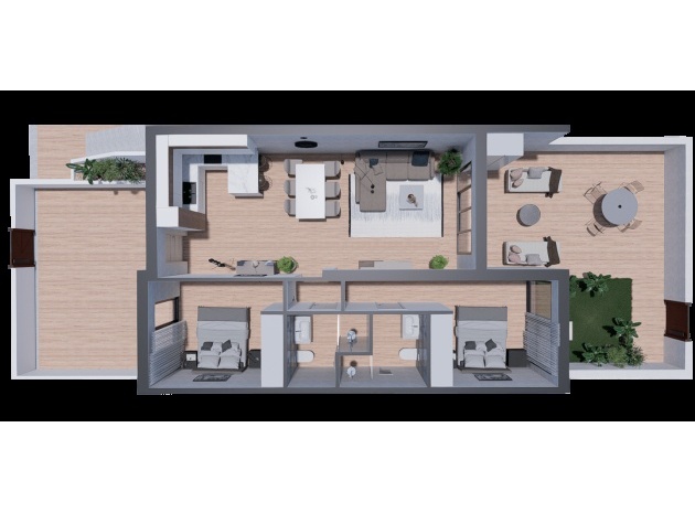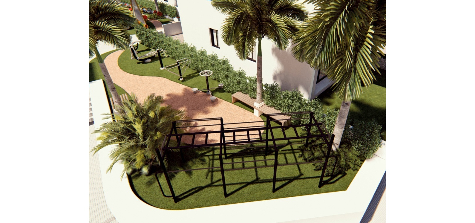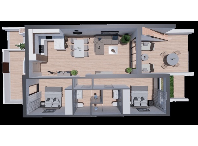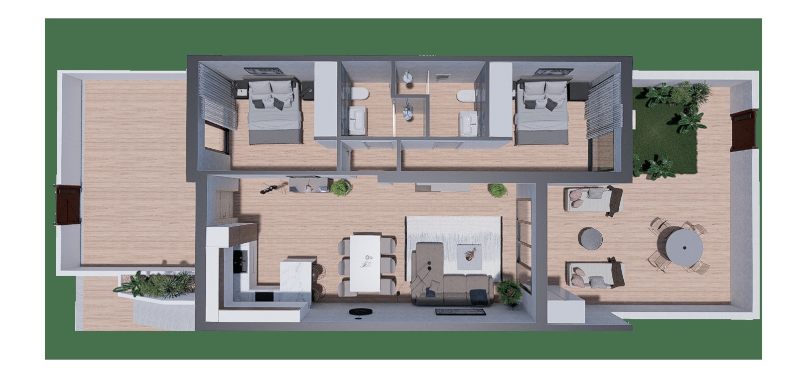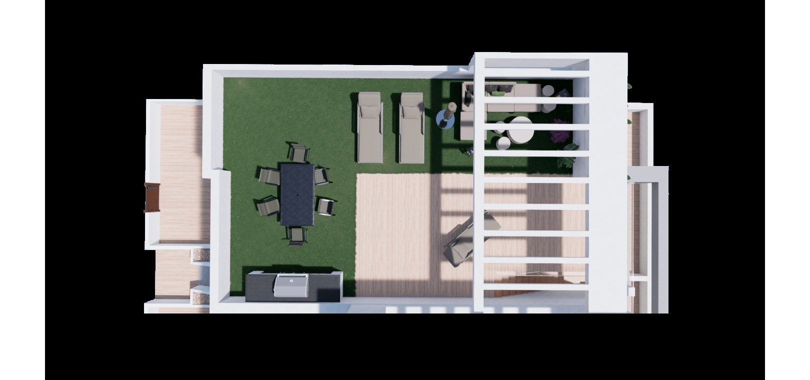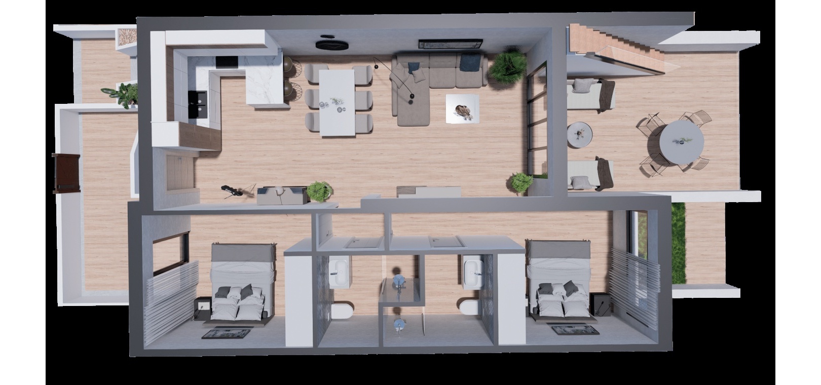 Vardagsrum, fullt utrustat kök med öppen planlösning, 2 x dubbelrum båda med inbyggda garderober, master med eget duschrum, 1 x familjebadrum, G/F terrass och trädgård eller balkong på 1:a våningen & 86m2 privat solarium, valfri underjordisk parkering med förråd, vackert designade gemensamma trädgårdar med 3 härliga gemensamma pooler och mycket mer.