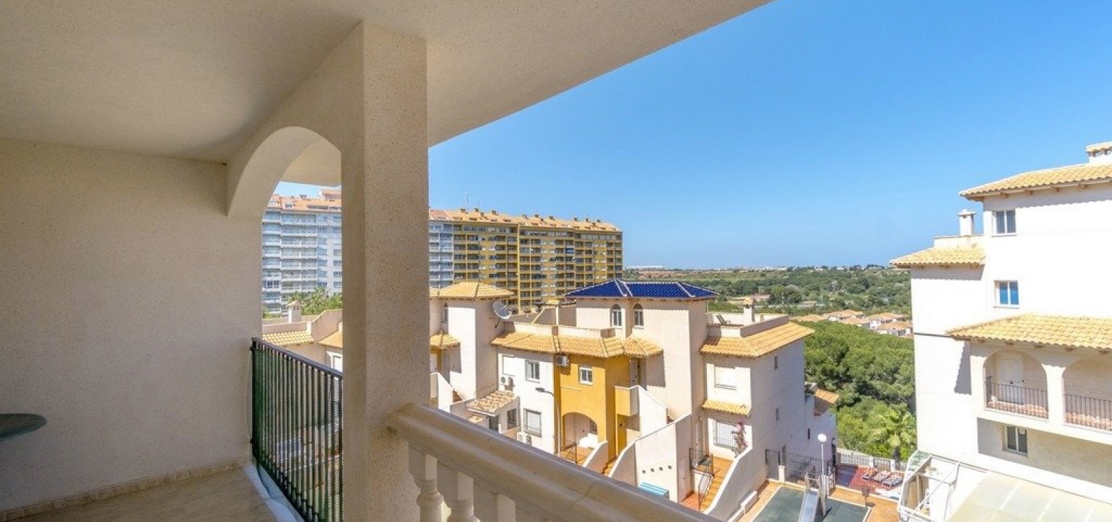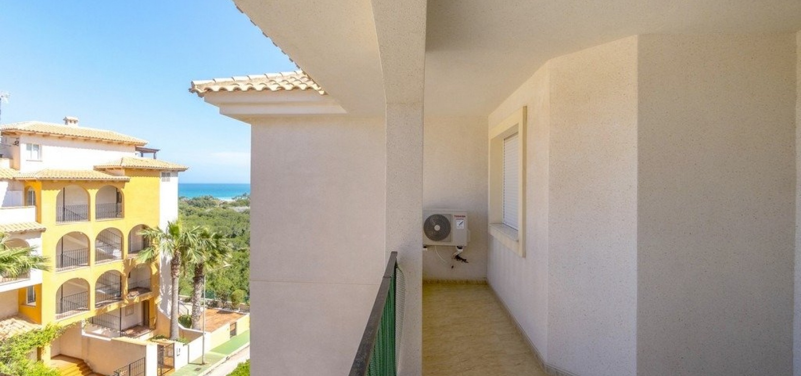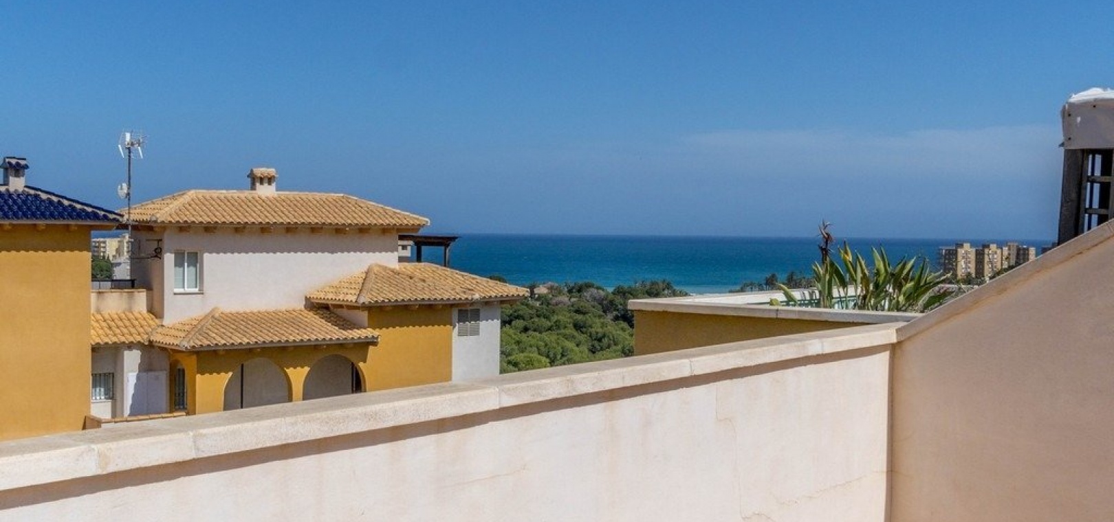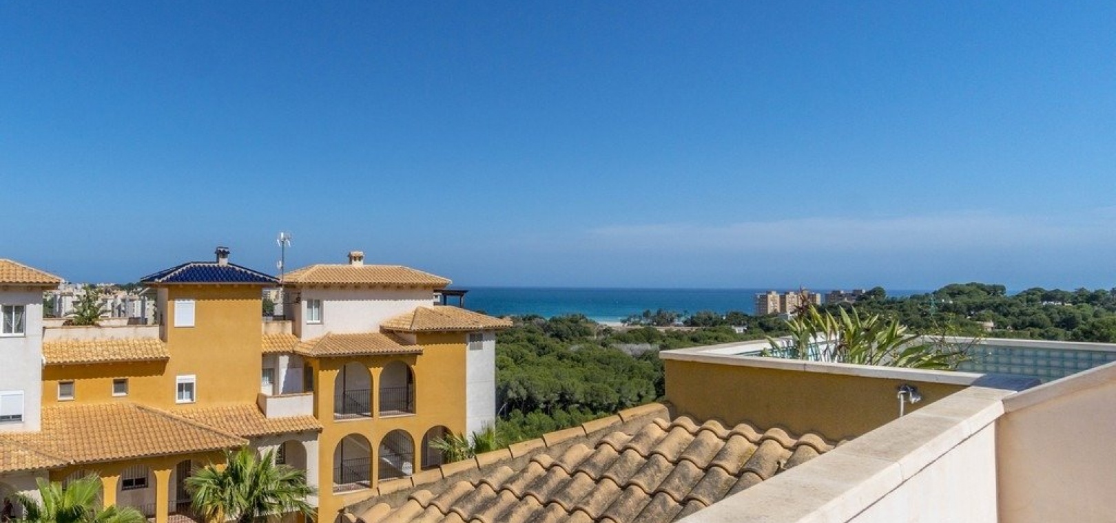 Vardagsrum/matsal med varm och kall A/C, ett fullt utrustat kök med öppen planlösning, 2 x dubbelrum, det största sovrummet har ett eget duschrum, 1 x familjebadrum, stor balkong utanför loungen havsutsikt, en mycket stor 50m2 privat takterrass med fantastisk utsikt, gemensam pool, barnpark, tennisbana och grönområden. & mycket mer.